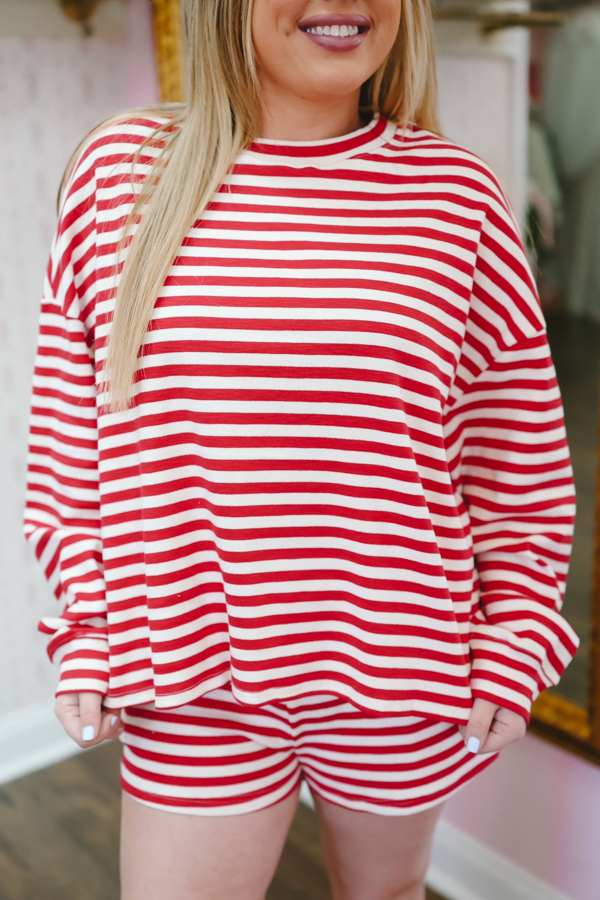 The Amara Striped Set is the ultimate cozy-cute matching moment. Featuring a relaxed, oversized striped long-sleeve top paired with matching comfy shorts, this set is soft, effortless, and made for lounging in style. The bold red and white stripes add a playful pop while keeping the look classic and easy.