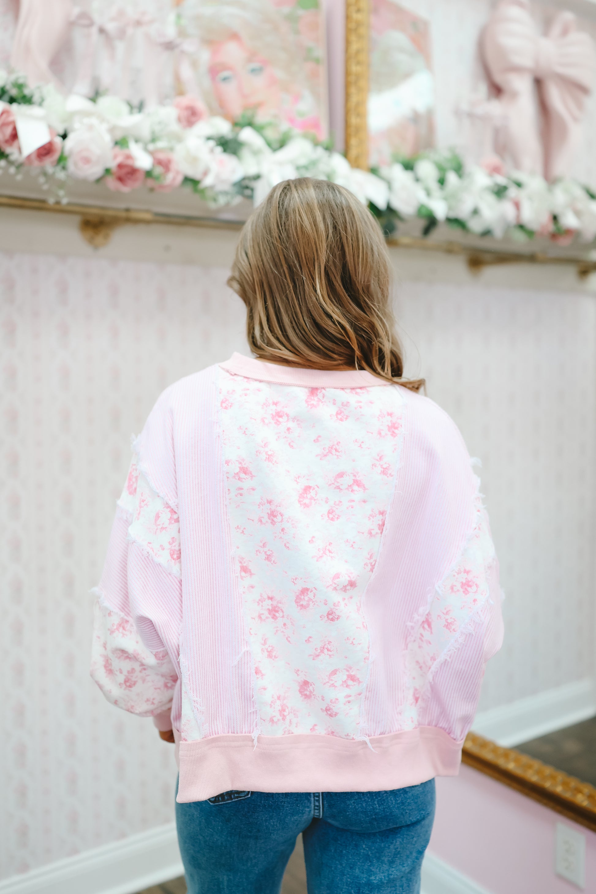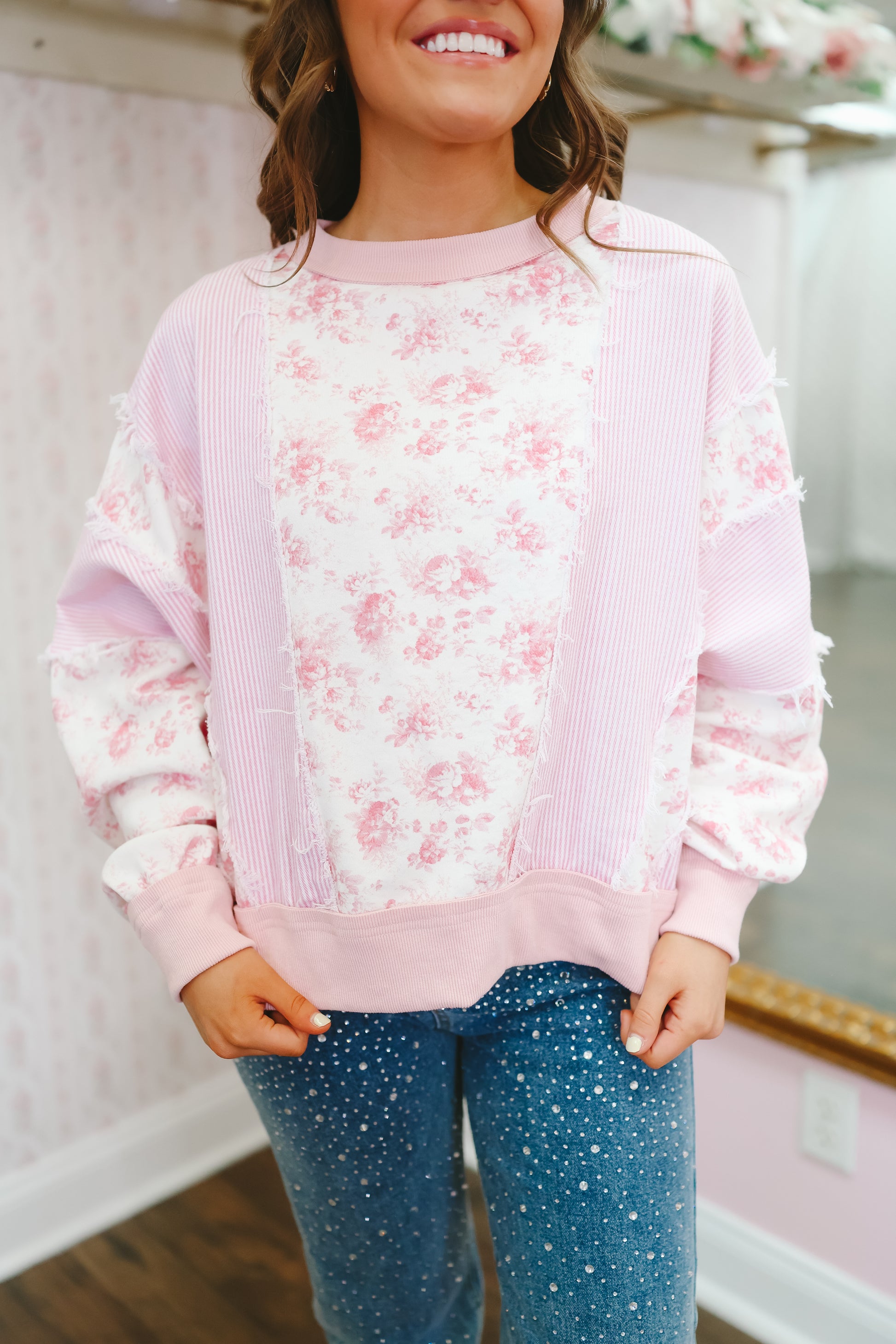 The Baker Floral Terry Stripe Color Block Top blends soft florals with subtle stripes for a cozy, feminine feel. This relaxed pullover features mixed textures and an easy fit, making it a go-to for casual, everyday styling with a sweet touch.