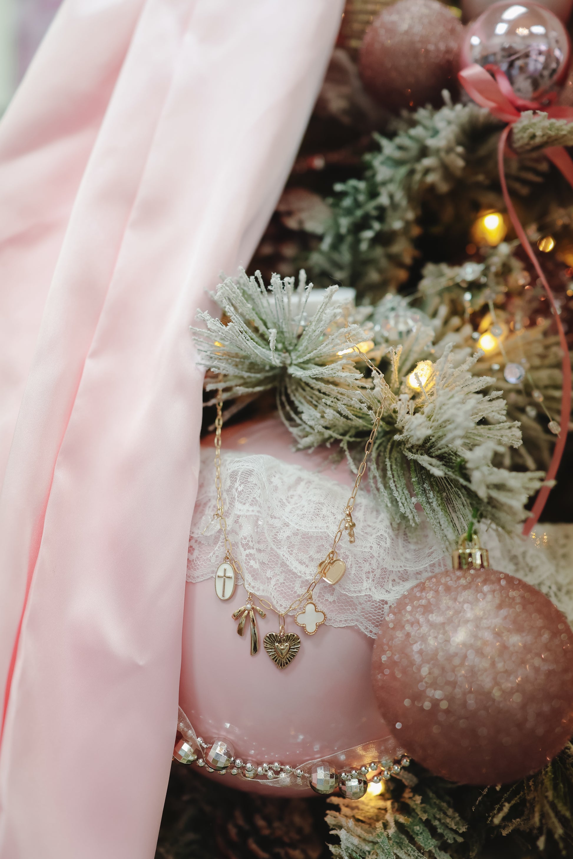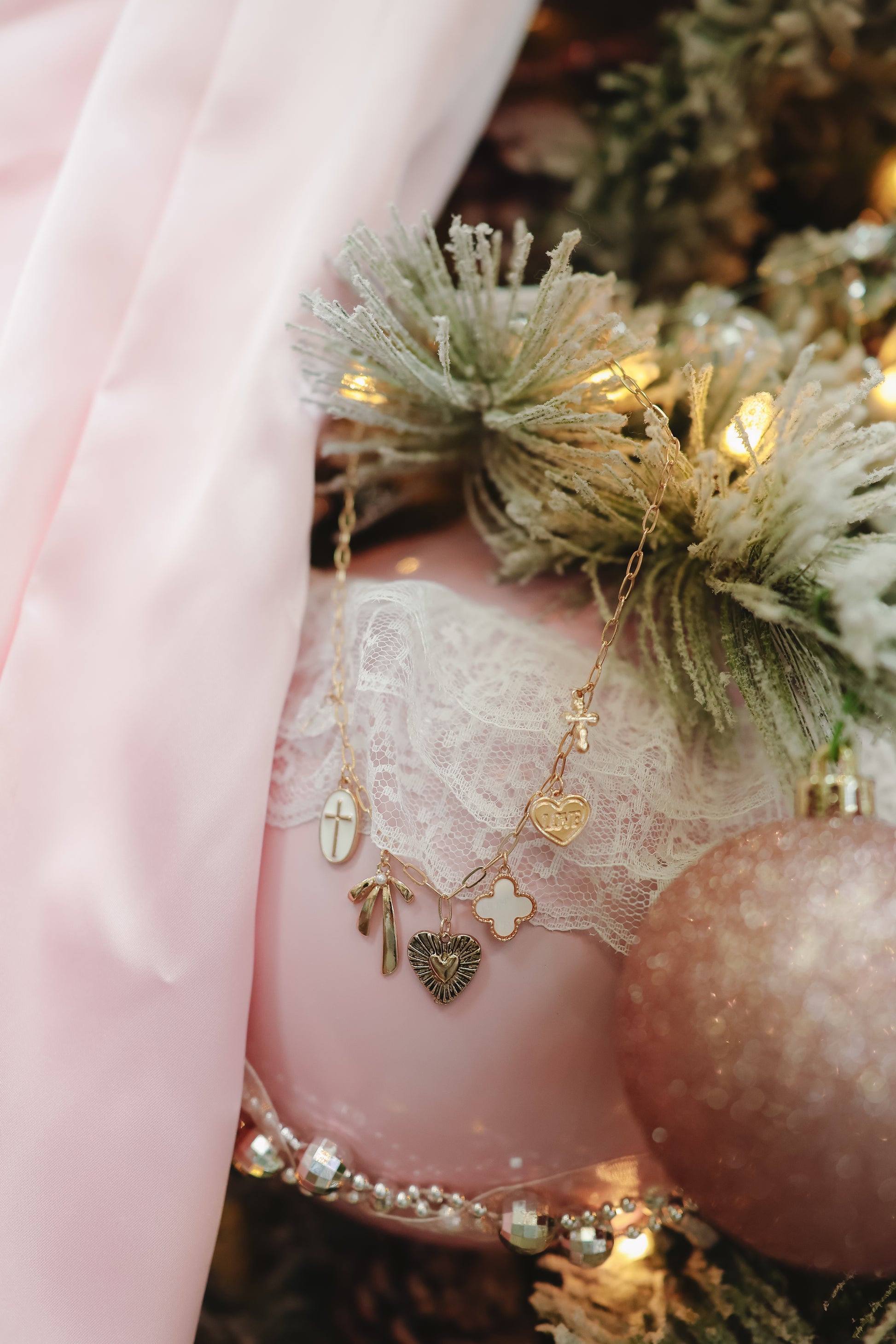 The Becky Bow Charm Necklace is a sweet, feminine statement piece made for the coquette girlie who loves a little sparkle in her everyday look. This gold-toned chain features a curated mix of dainty charms — including a bow, heart, clover, pearl-accented cross, and a textured love-heart — giving it that vintage-inspired, romantic feel. Lightweight, elegant, and easy to style, it layers beautifully with your favorite basics or stands alone as the perfect finishing touch to any soft-girl outfit. Whether you’re dressing up for date night or adding a hint of glam to a casual day look, this necklace brings all the dreamy, bow-kissed vibes.