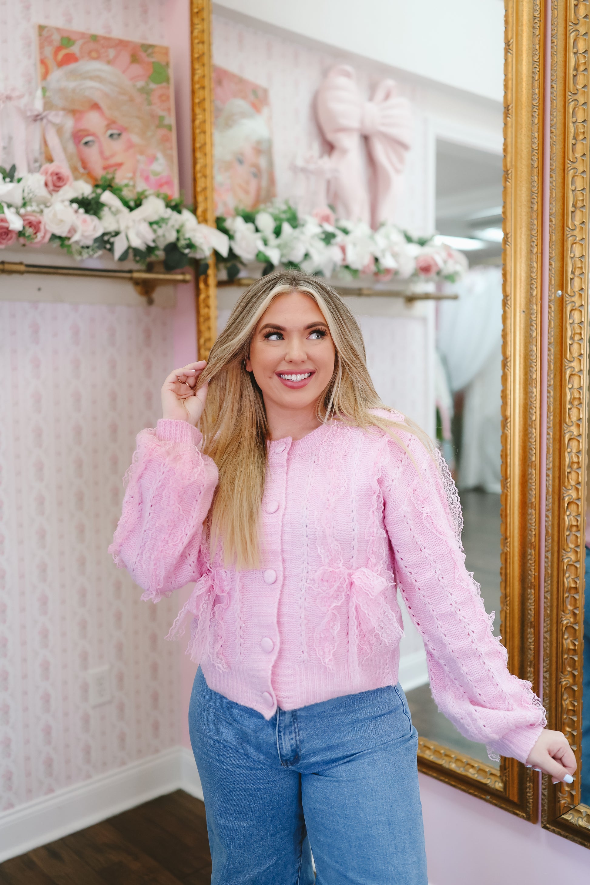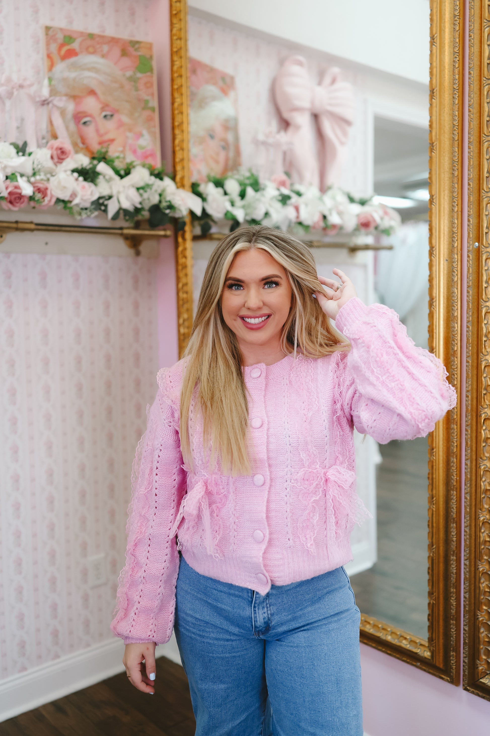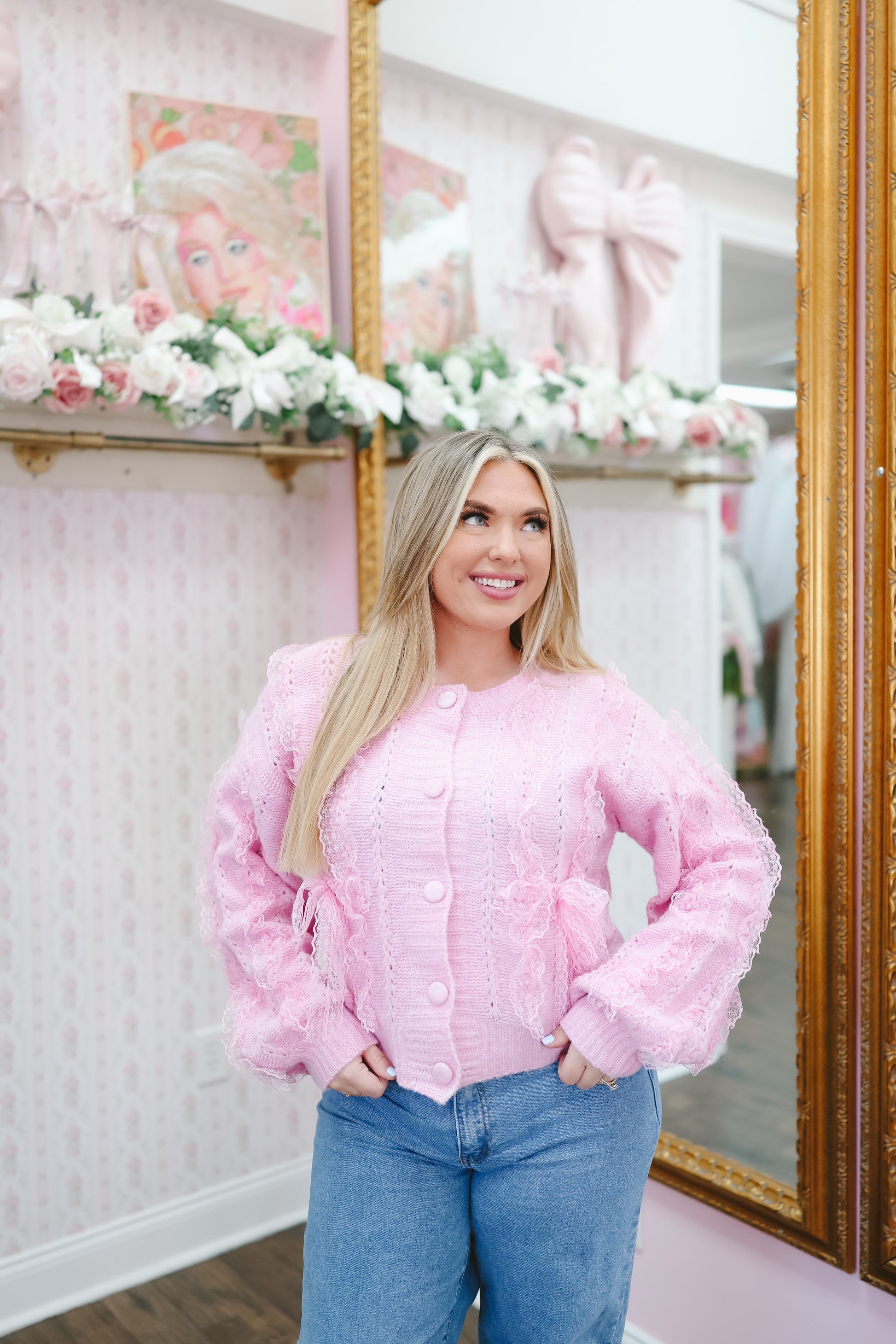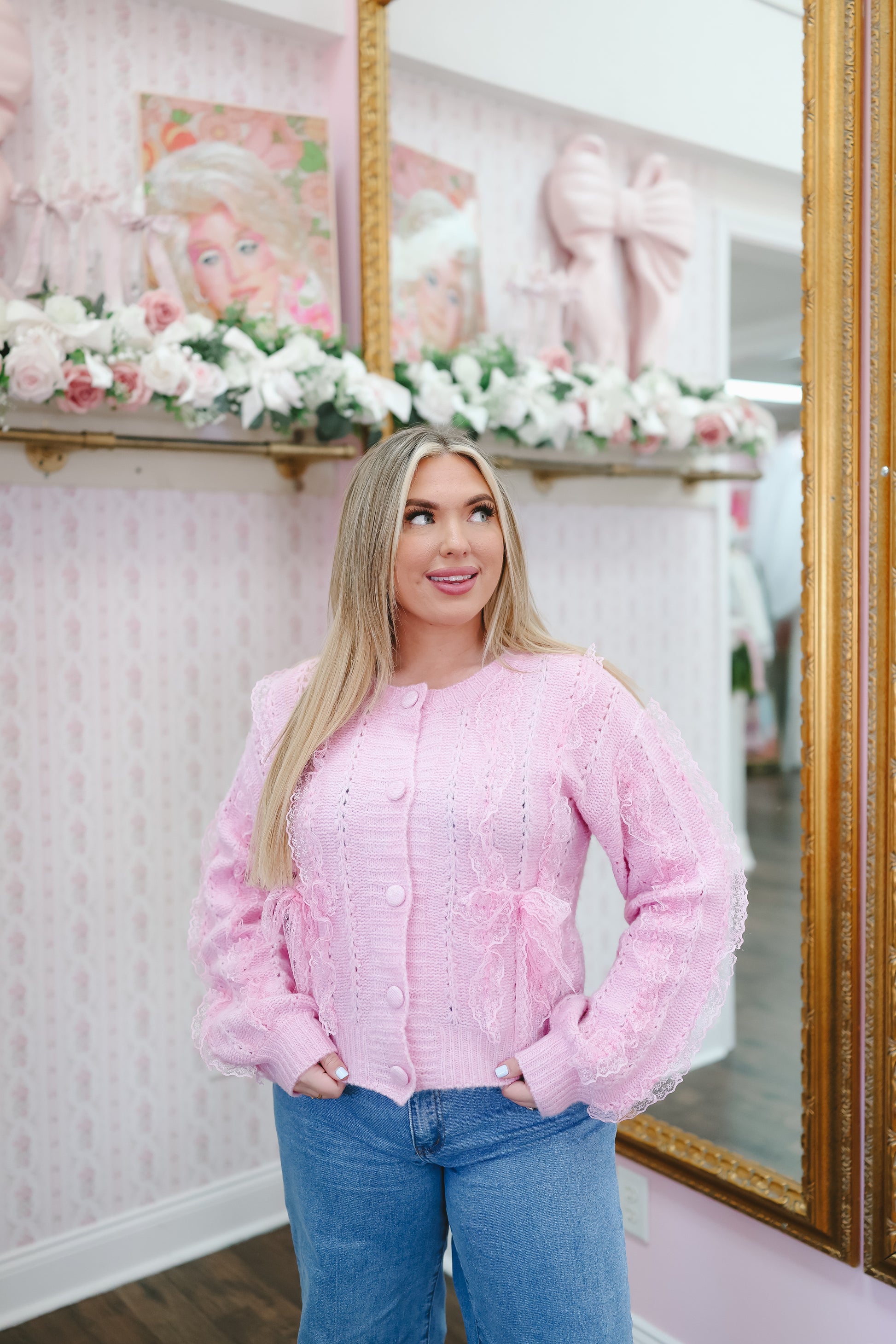 The Brenna Lace Trim Bow Cardigan is a dreamy knit layer with the prettiest feminine details. Designed in a soft lavender pink hue, this cardigan features delicate lace trim and bow accents that add a romantic, vintage-inspired touch to any outfit.