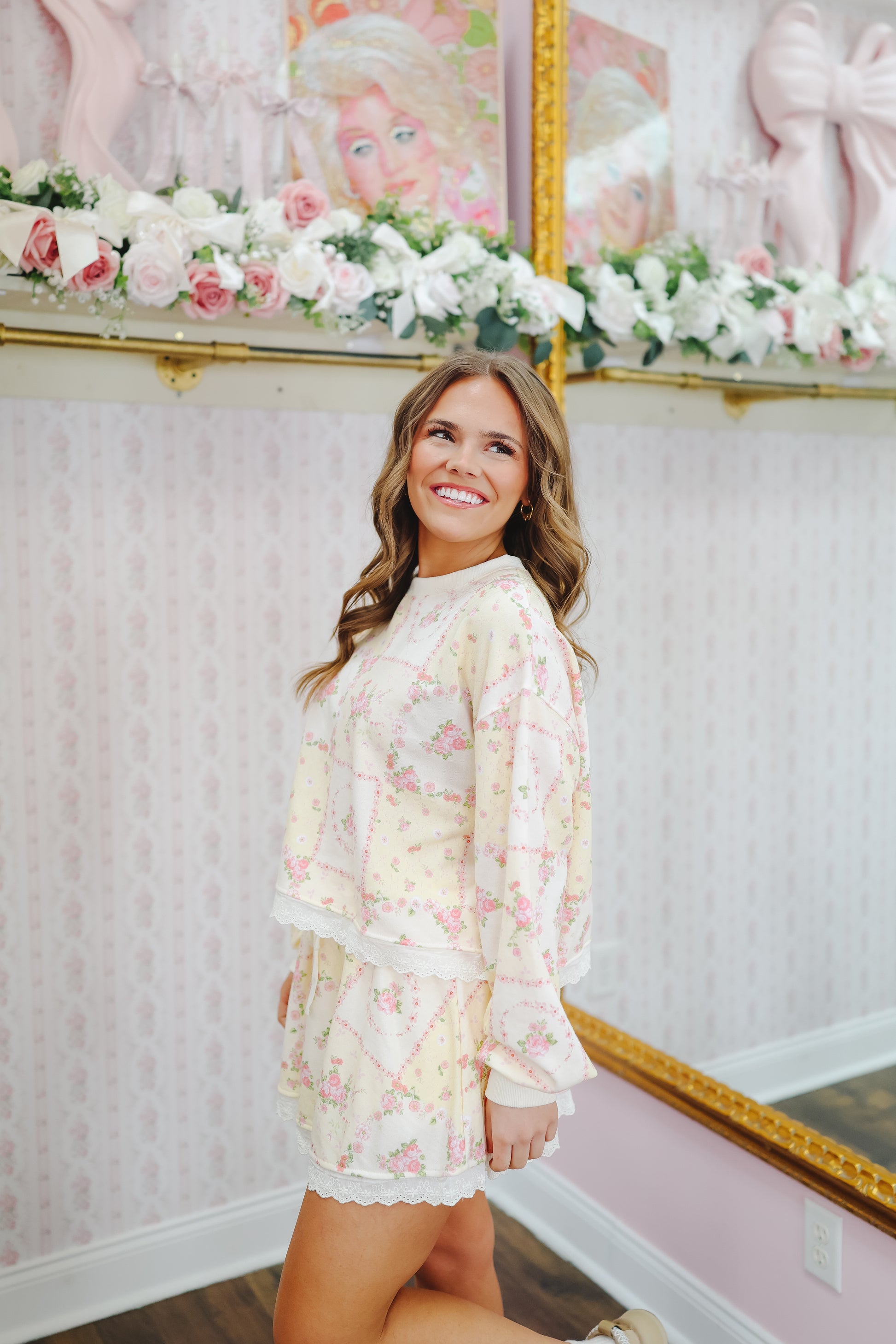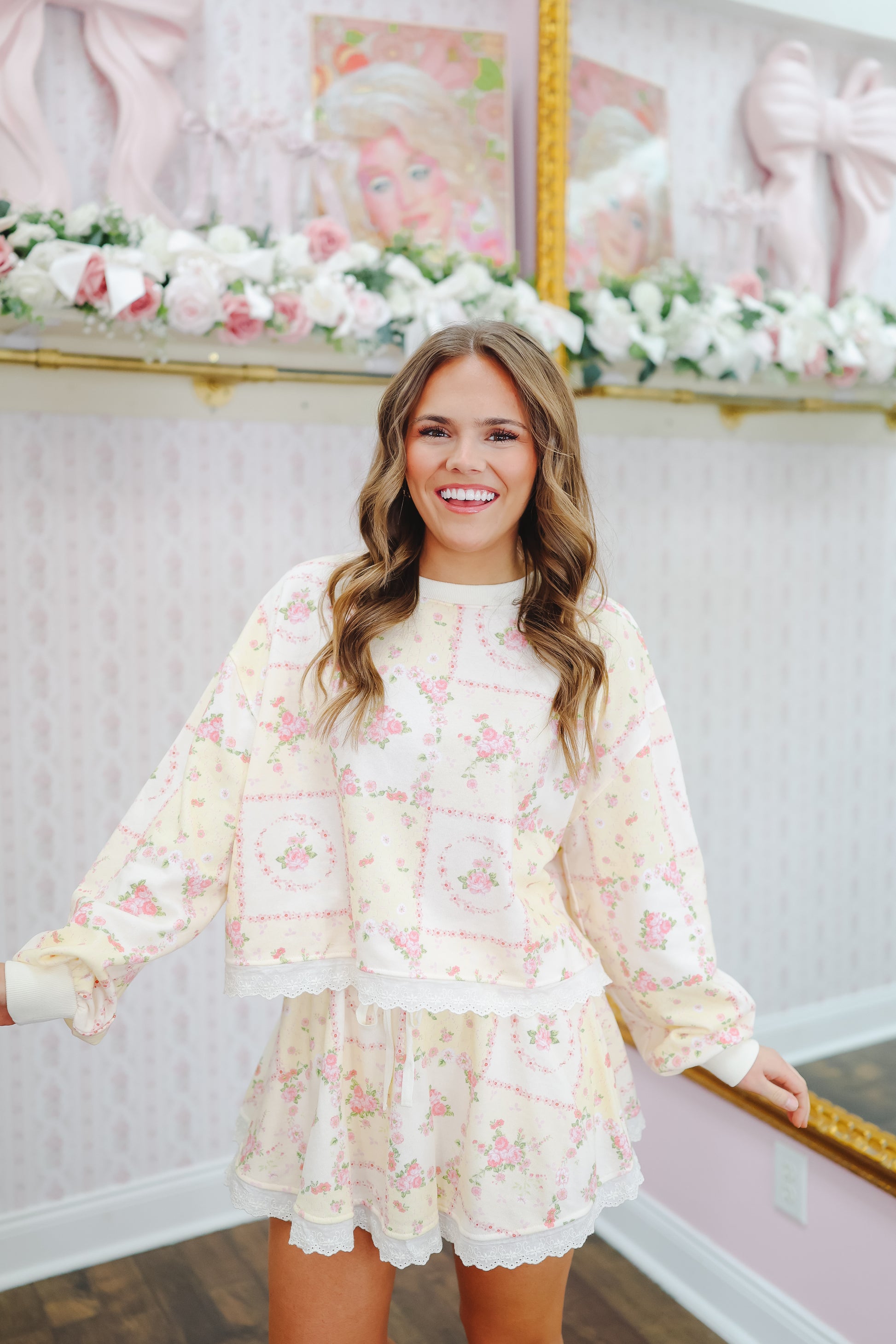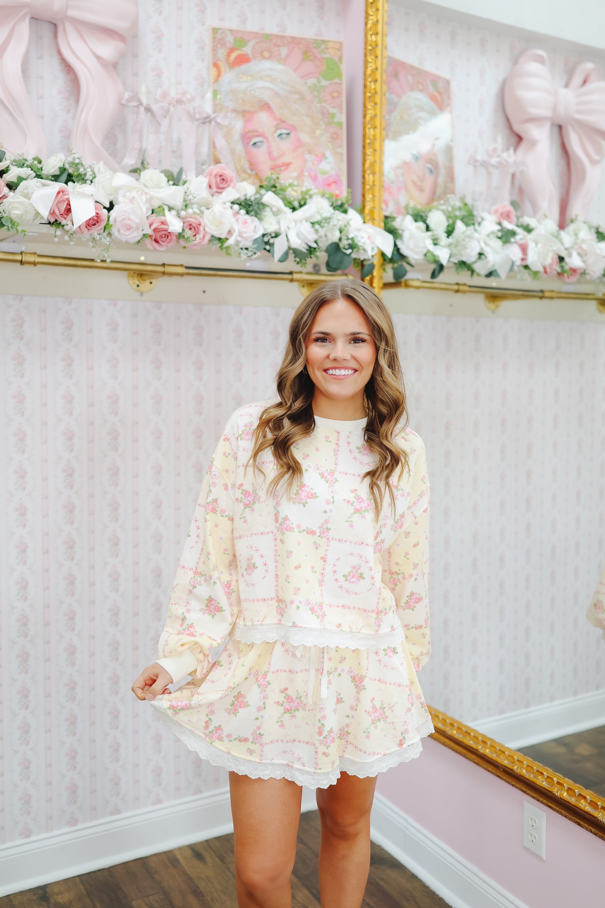 The Britt Vintage Floral Lace Trim Skort Set brings soft cottage-core charm with an easy, wearable feel. Featuring a light yellow vintage floral print and delicate lace trim, this matching set is sweet, comfy, and effortlessly feminine.