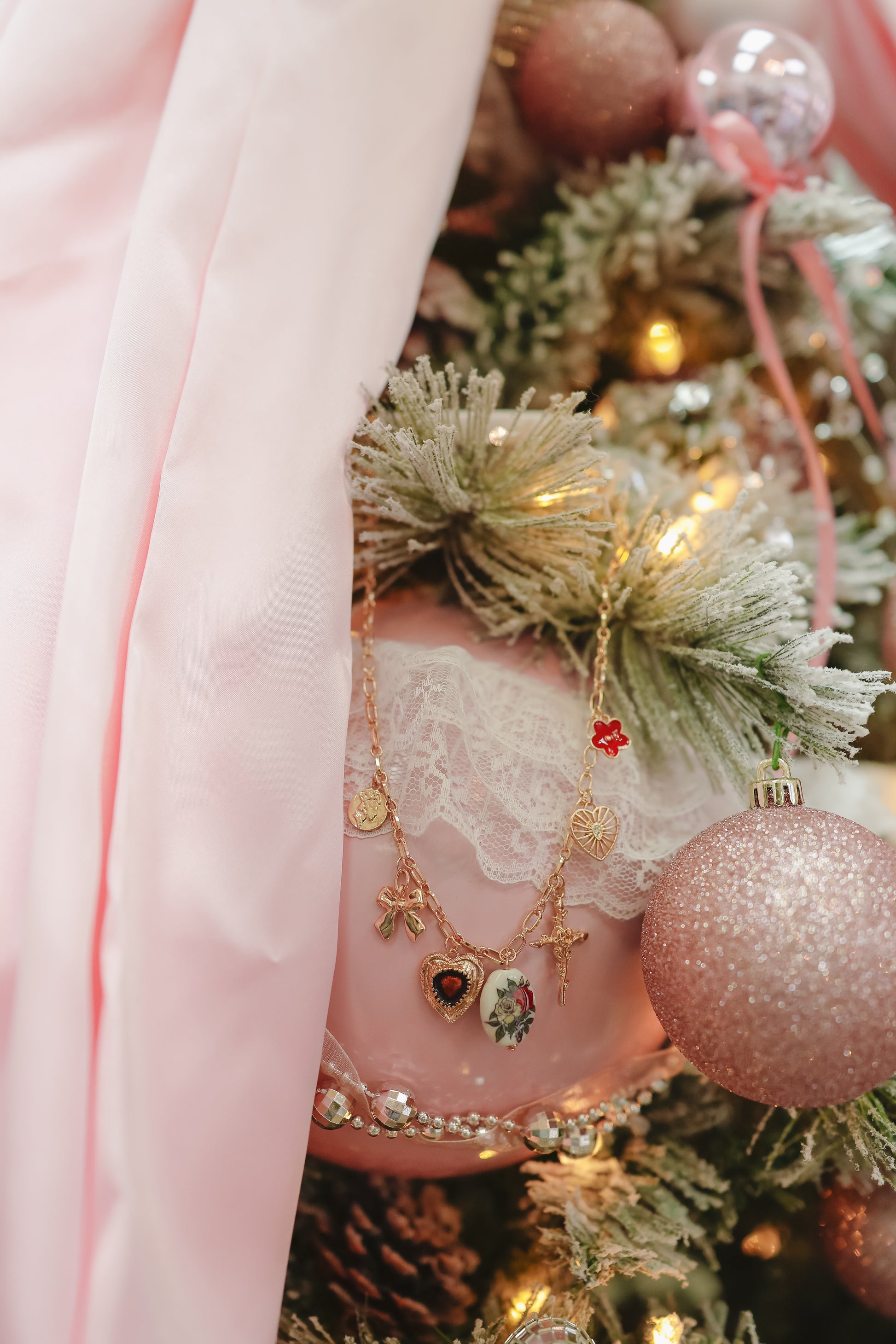 Meet the Chelsea Charm Necklace, your new bow-kissed, heart-filled, coquette statement piece. This gold charm necklace layers vintage romance with modern girl glam — featuring a mix of hearts, florals, a dainty bow, and a rose-detailed cross for that soft-feminine, slightly dreamy touch. Each charm drops from a chic paperclip chain, making it the perfect piece to dress up holiday looks, brunch outfits, or your everyday “I want to feel pretty” moments. Wear it alone for a delicate sparkle or stack it with your favorite TR layers for the ultimate coquette aesthetic.