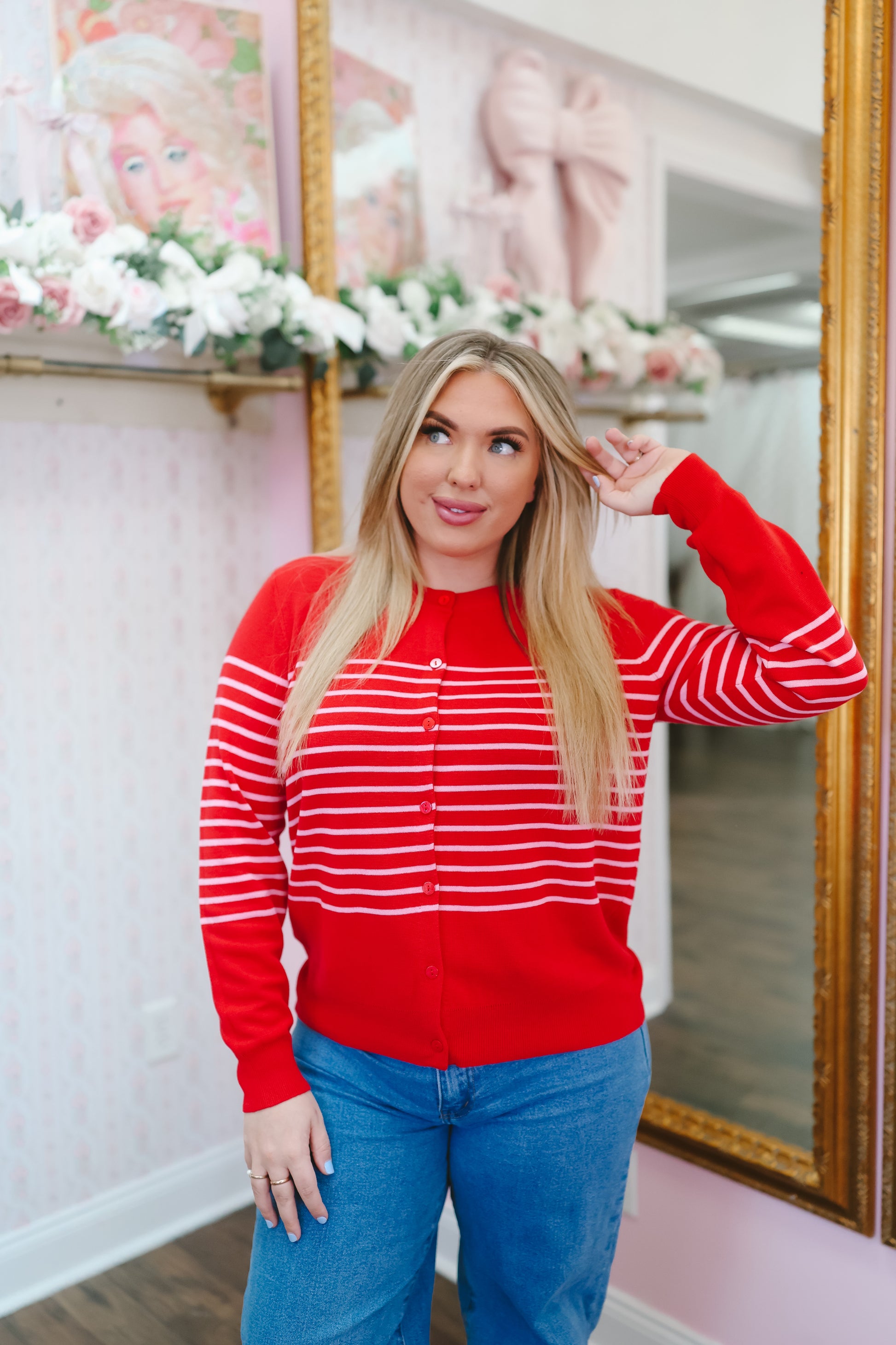 The Christie Striped Button Down Cardigan is a classic layer with a playful pop of color. Designed in a bold red with soft pink stripes, this lightweight knit cardigan features a button-down front and an easy, relaxed fit. It’s the perfect piece for layering while adding a fun, feminine touch to everyday outfits.