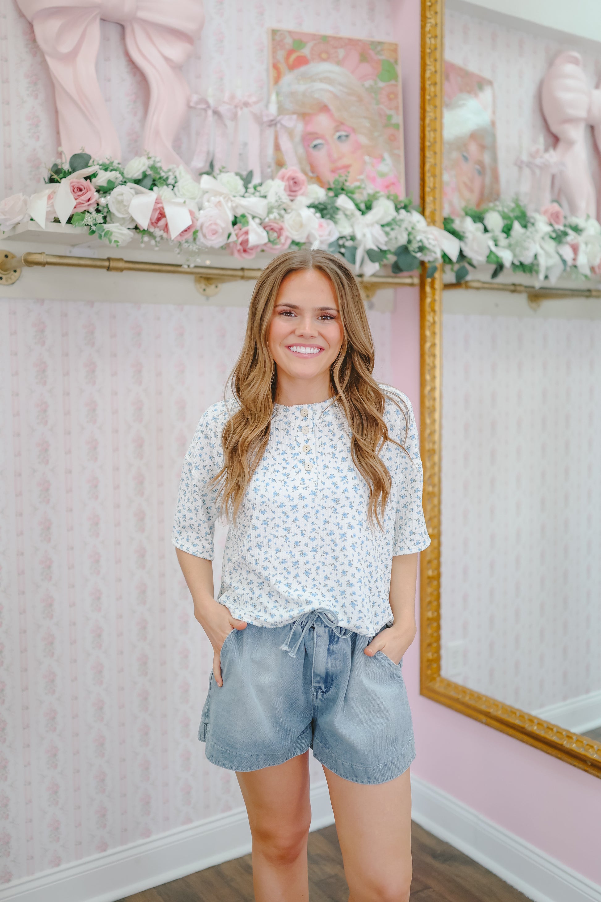 The Cindy Floral Ribbed Henley Top – Blue is your go-to for soft, effortless comfort with a feminine twist. Featuring a delicate blue floral print on a cozy ribbed knit, this relaxed henley top is perfect for lounging, casual days, or pairing with matching shorts for a cute coordinated look.