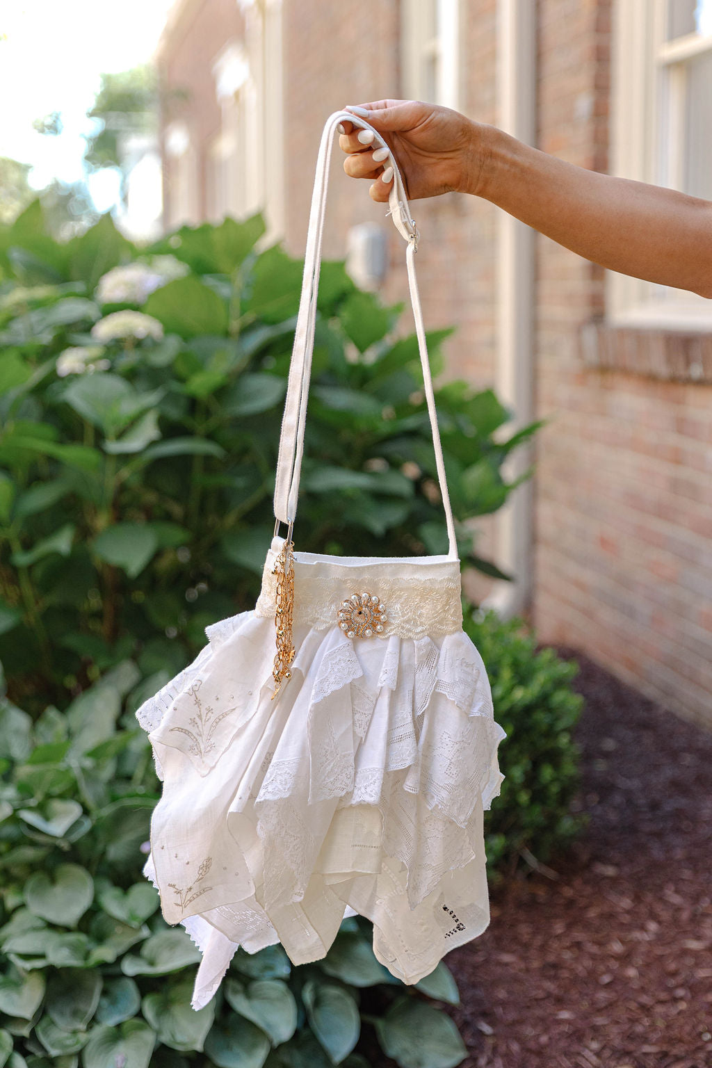 These bags are handmade by Karyn in the kitchen of her home nestled in Portland, Tennessee and the vintage and Victorian-era hankies are all organically sourced at the time of production of each bag. These bags are truly one of a kind, and there will never be two of the same bags, simply just because you can't find hankies that are two of a kind. We are so excited to finally have premade bag options available online to you to avoid wait times on custom orders! What you see photographed is what you get! If you are searching for perfection- these are not the bags for you! There are memories and moments in every hankie and piece of jewelry attached (some costume and some vintage) so you should expect wear spots on your bag. Karyn has perfected hiding most of the imperfections, but be aware you are buying a piece of art, history, and someone’s life moments.