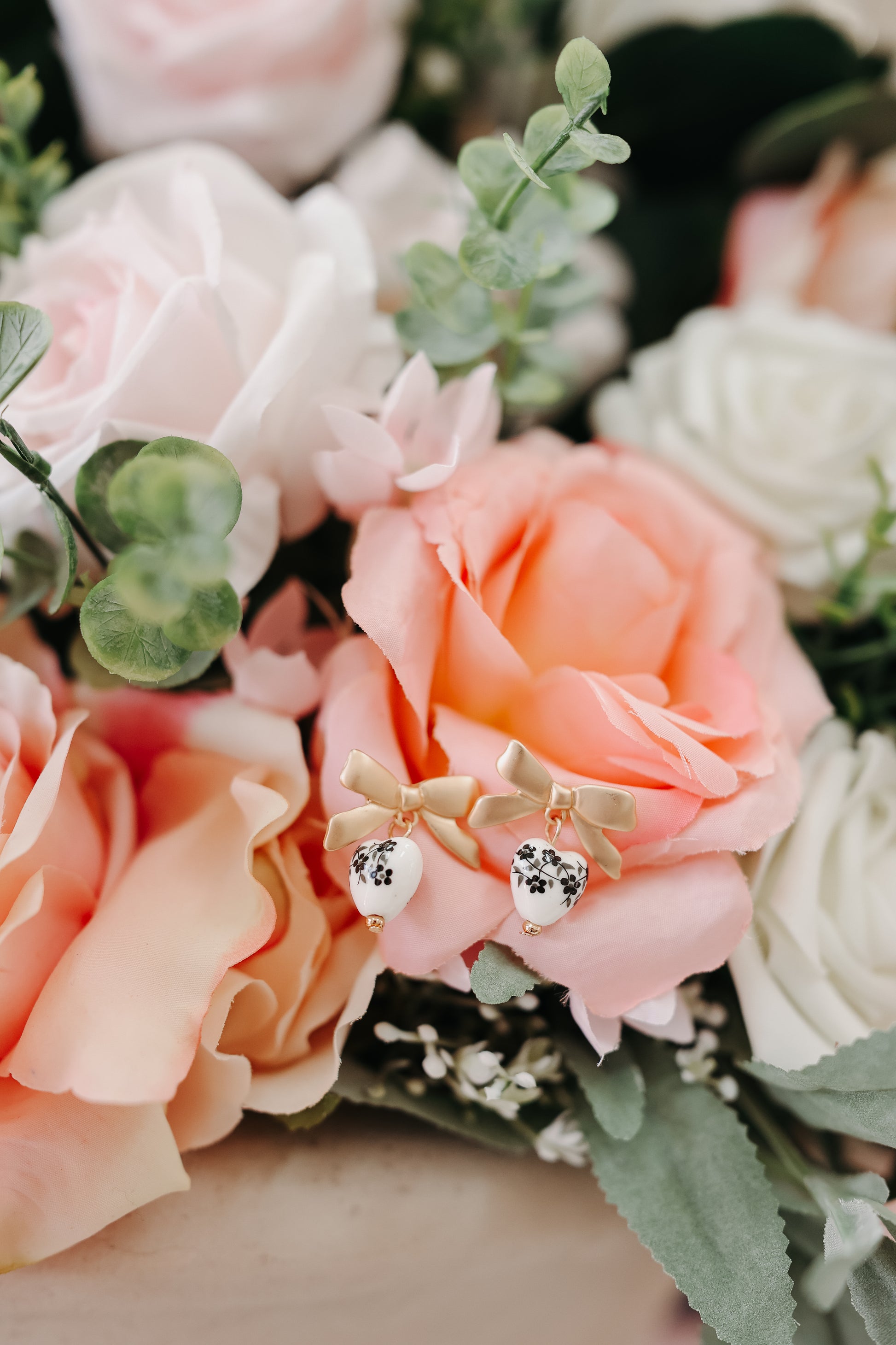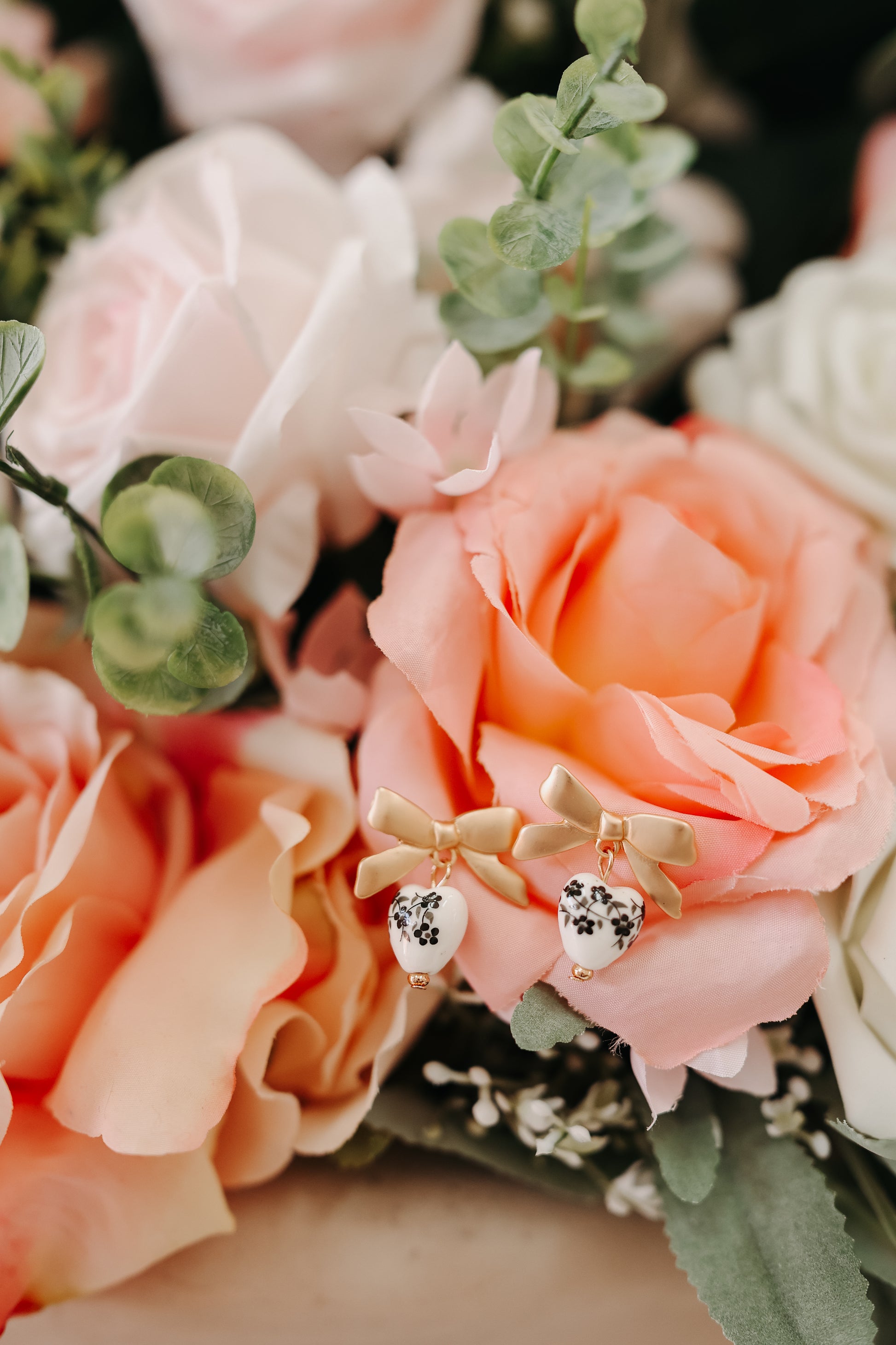 Feminine with a vintage flair. The Gineva Bow Heart Earrings feature delicate satin gold bows paired with black floral ceramic hearts, creating a sweet yet elevated statement. Whether you're dressing up a casual outfit or finishing a romantic look, these earrings add just the right touch of charm.
