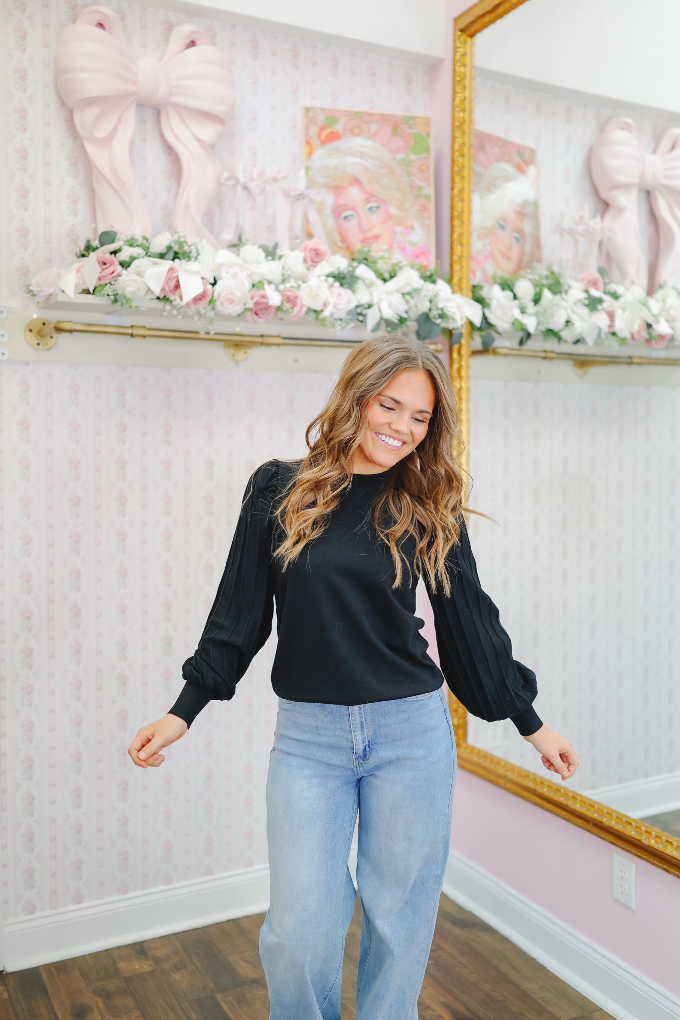 The Gisele Striped Sleeve Top – Black brings elevated elegance to your everyday winter wardrobe. Designed in a black hue, this sweater-style top features statement pleated sleeves that add volume, texture, and a polished feminine touch. The soft knit body keeps things effortlessly comfortable, while the structured sleeves make it a standout piece you can dress up or down. Perfect for holiday gatherings, workdays, or cozy weekends, this chic top delivers style with zero effort.