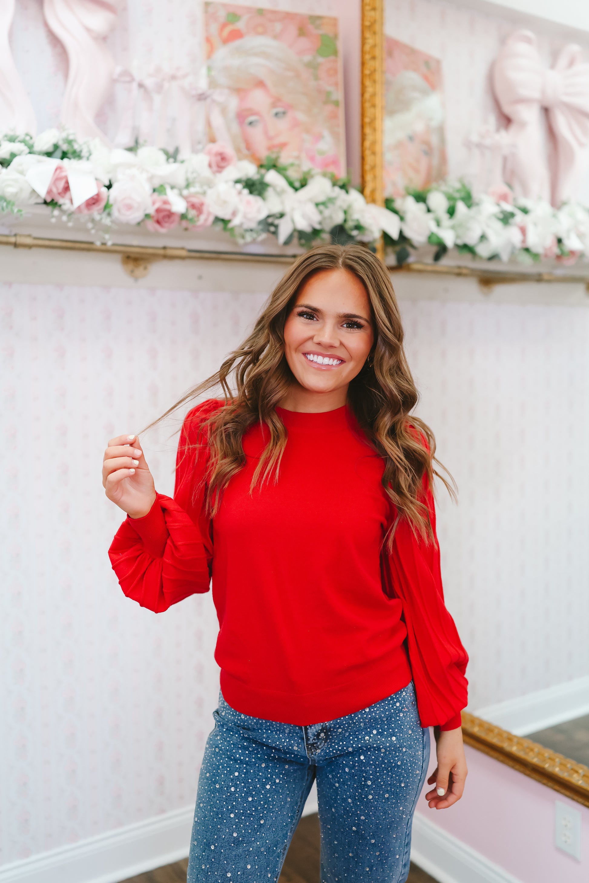 Shop the look: Melissa Scalloped Hem Pointelle Sweater - Pink/Red, Maddie Rhinestone High Rise Jeans – Medium Wash