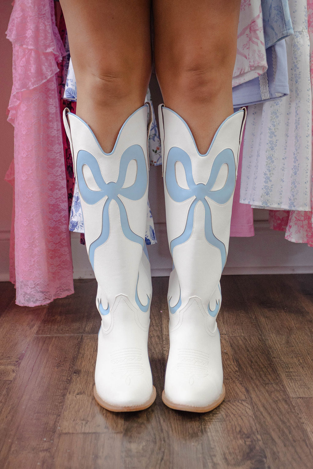 Be the icon. Be the moment. Our Glenda Boots in light blue are everything your girly western dreams are made of. With buttery white faux leather and pastel blue inlay detailing, these knee-high boots feature dainty bow-inspired stitching and a sleek pointed toe. The low stacked heel gives you just the right lift while keeping things comfortable enough for all-day wear—from rodeo nights to girls’ brunches. Flirty, bold, and ready to make an entrance—these are the boots your closet’s been waiting for.