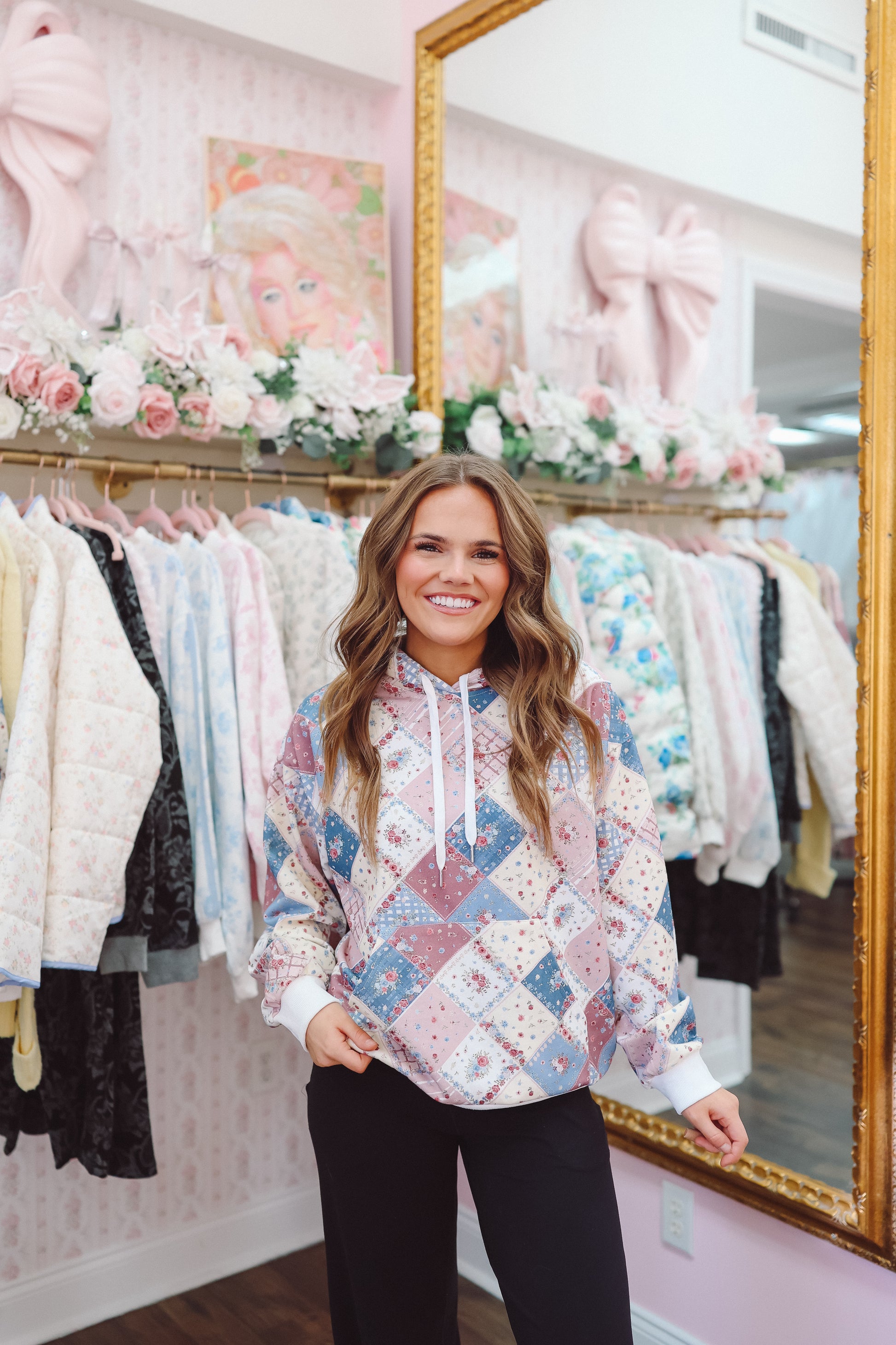 Meet the Haven Patchwork Quilted Hoodie — the coziest, cottage-core dream your closet didn’t know it needed. This standout piece blends a soft quilt-inspired patchwork print with pastel florals and gingham blocks for a feminine, vintage-inspired vibe. Designed with a relaxed fit, kangaroo pocket, and contrast ribbed trims, Haven delivers that effortless “curl-up-and-still-look-cute” energy.