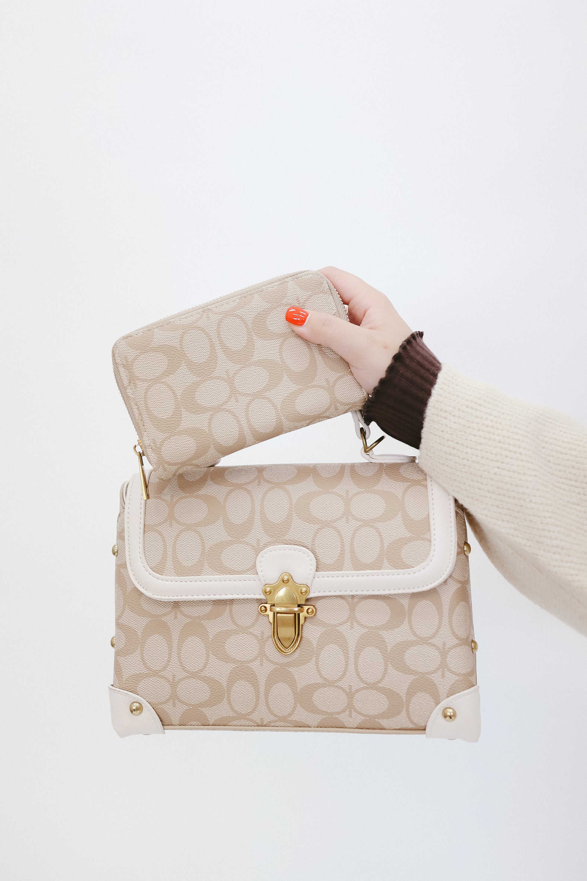 Upgrade your everyday carry with the Hilary Handbag & Wallet Set in a timeless taupe and white colorway. This two-piece set combines modern sophistication with function. The structured handbag features a sleek silhouette, gold hardware accents, and sturdy top handles for an elevated look, while the matching wallet keeps your cards and cash stylishly secure. Whether you're headed to brunch, the office, or running errands, this set effortlessly complements both casual and dressy outfits.