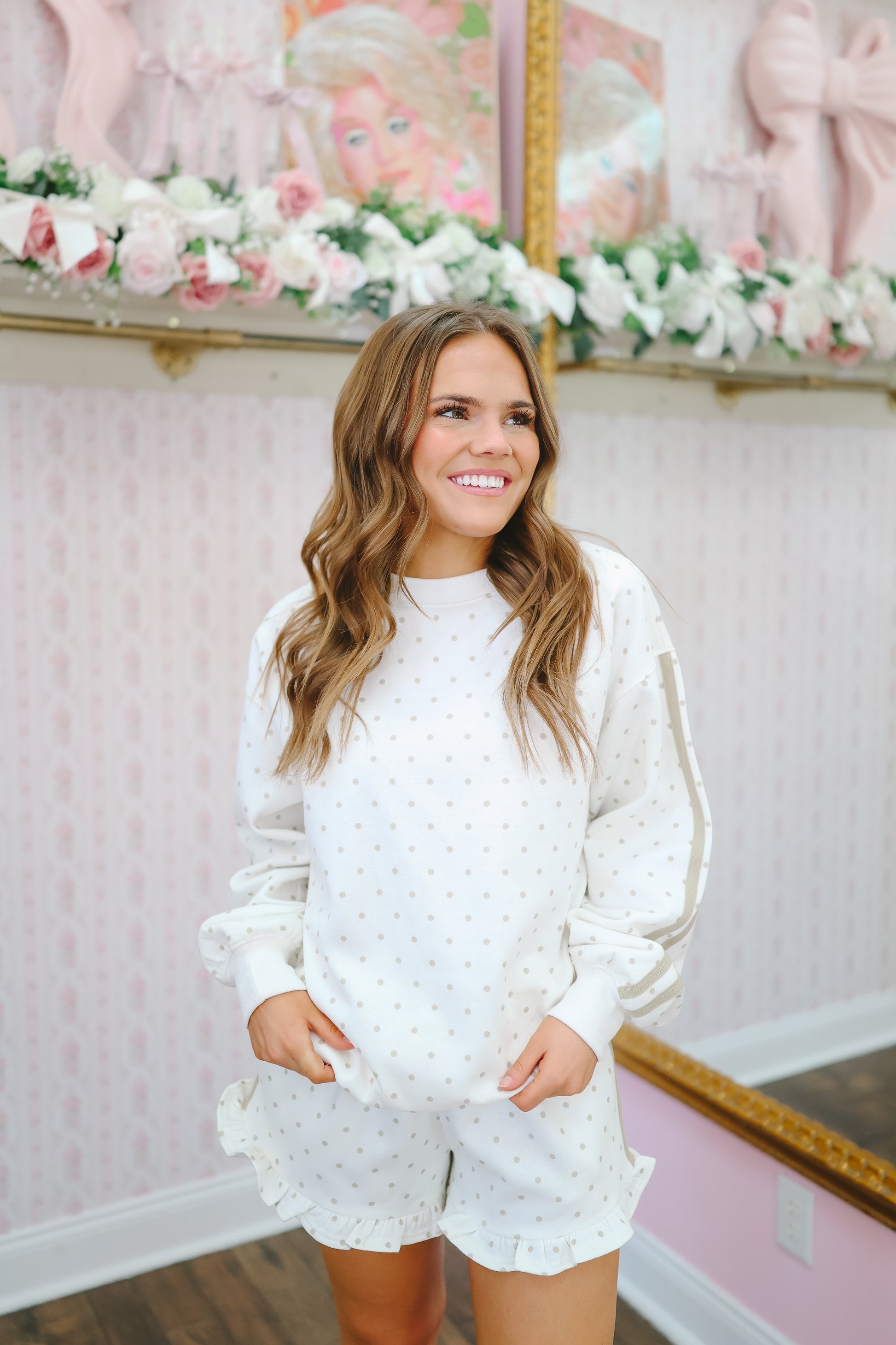 The Juliette Polka Dot Ruffle Set – Cream/Taupe is the ultimate cozy-cute lounge look. Featuring a soft polka dot sweatshirt paired with matching ruffle hem shorts, this set blends comfort and feminine charm for everyday lounging, errands, or casual days out.