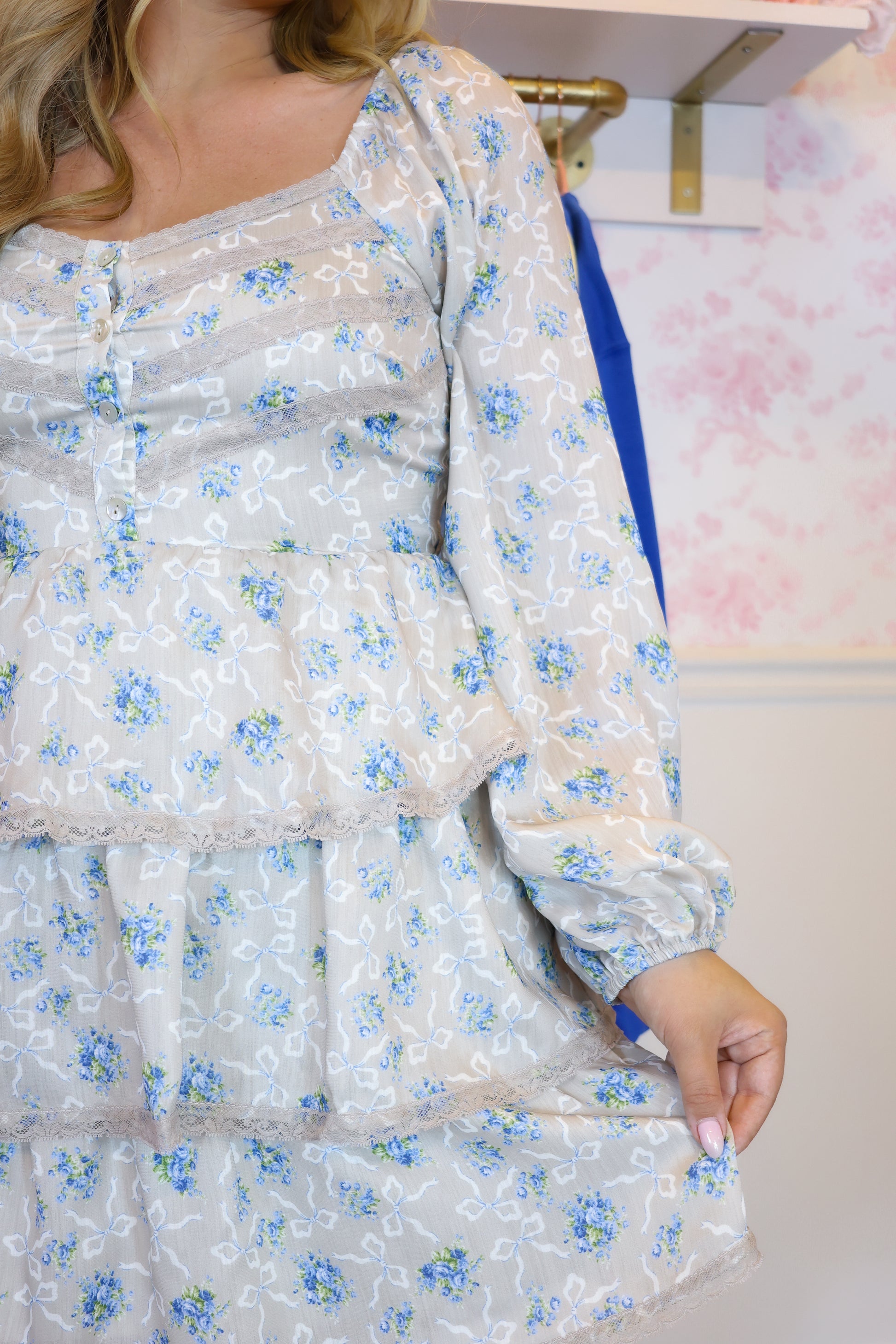 Step into sweet romance with the Katrina Tiered Floral Bow Print Dress in taupe and blue — a flirty mini made for twirling. Soft blue florals and playful bow prints dance across a warm taupe base. The square neckline and fitted bodice hug your waist, while the smocked back ensures comfort and a flexible fit. Long puff sleeves with elastic cuffs frame your arms with elegance, and a three-tiered skirt finished with delicate lace trim adds airy movement and charm to every step. Perfect for sunny brunches, garden parties, or date nights — style it with wedges, strappy sandals, or a cute denim jacket when it gets breezy.