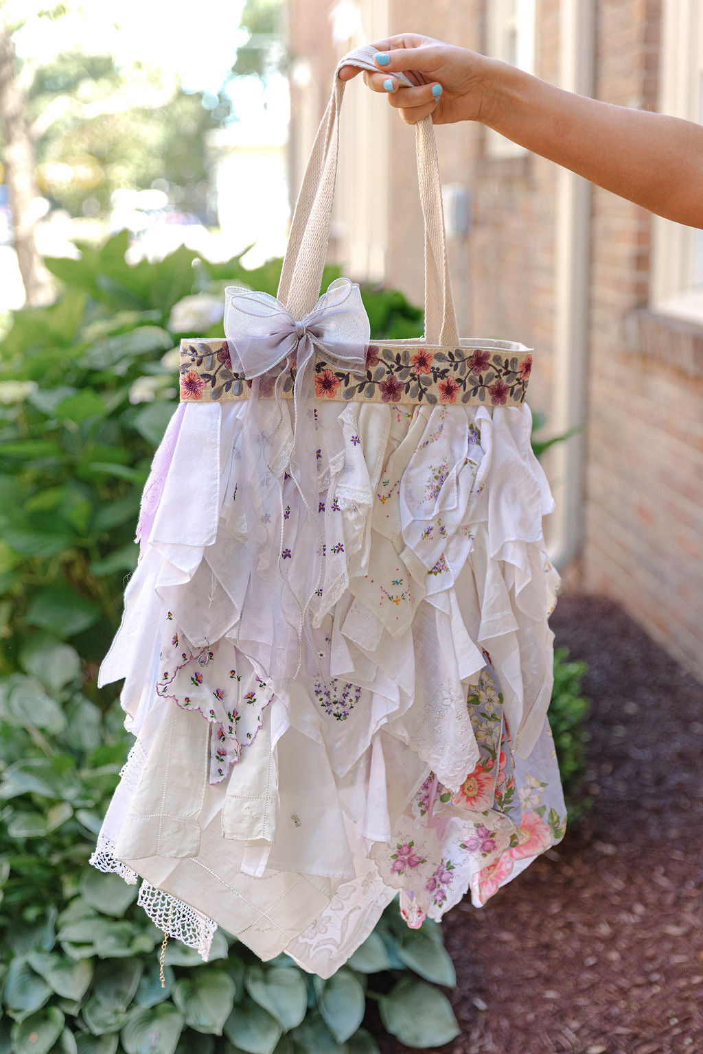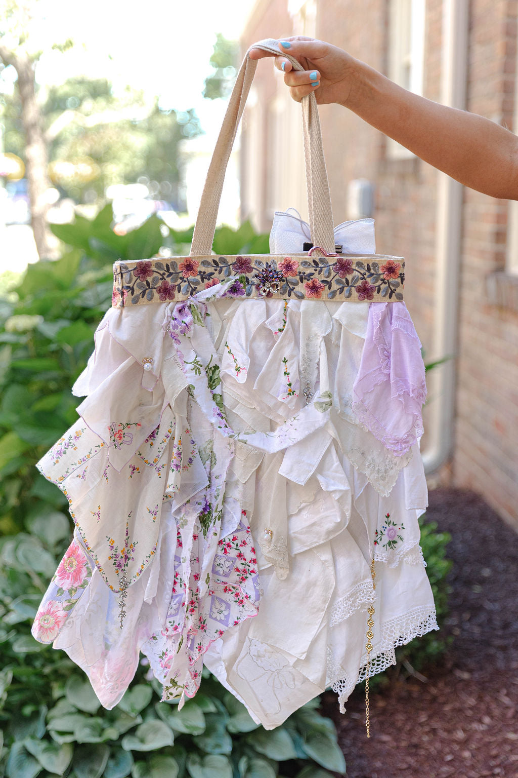 These bags are handmade by Karyn in the kitchen of her home nestled in Portland, Tennessee and the vintage and Victorian-era hankies are all organically sourced at the time of production of each bag. These bags are truly one of a kind, and there will never be two of the same bags, simply just because you can't find hankies that are two of a kind. We are so excited to finally have premade bag options available online to you to avoid wait times on custom orders! What you see photographed is what you get! If you are searching for perfection- these are not the bags for you! There are memories and moments in every hankie and piece of jewelry attached (some costume and some vintage) so you should expect wear spots on your bag. Karyn has perfected hiding most of the imperfections, but be aware you are buying a piece of art, history, and someone’s life moments.