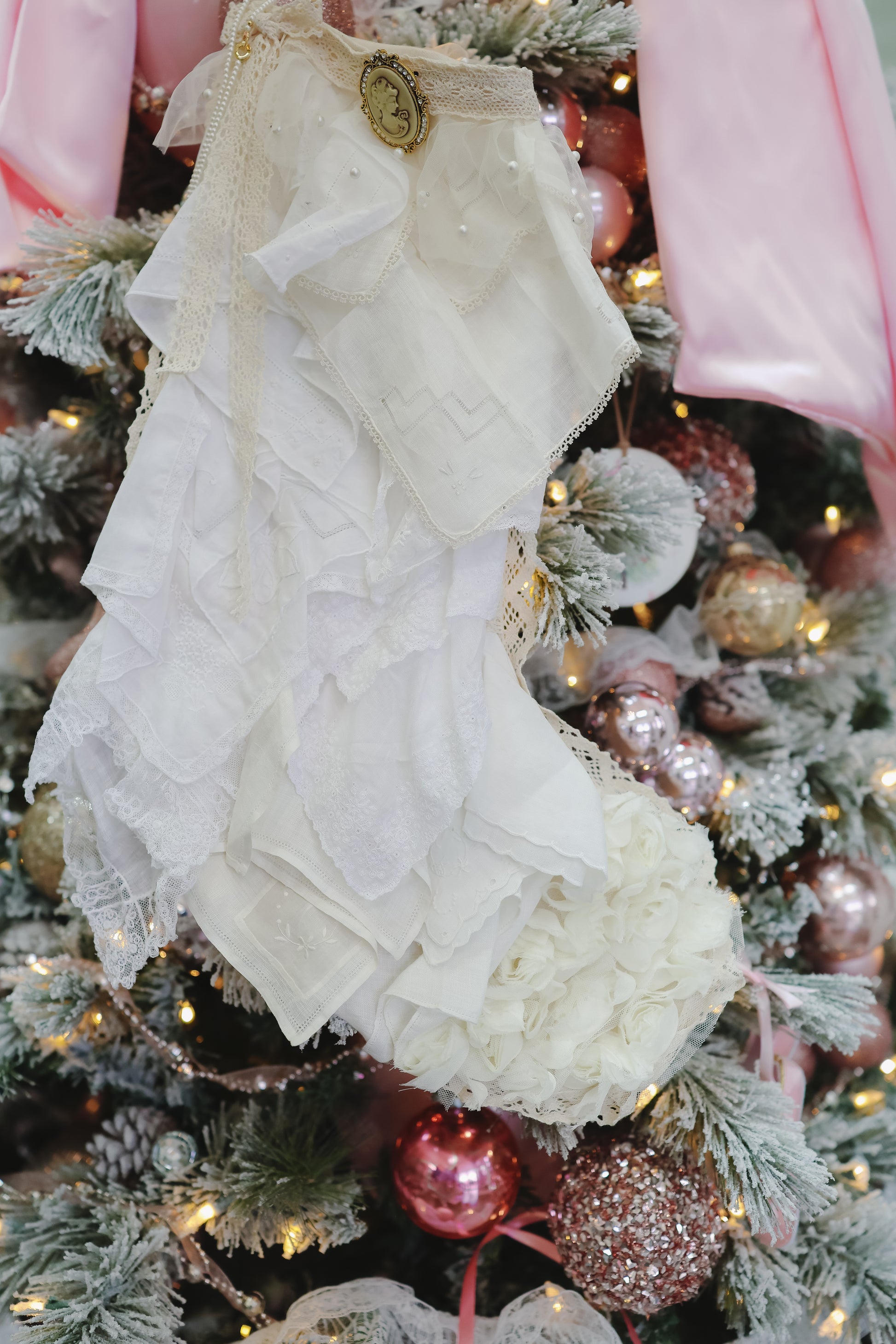 Each stocking is handmade by Karyn in the kitchen of her home in Portland, Tennessee. Every ruffle, lace trim, embroidered corner, and delicate hankie is organically sourced at the time of creation, meaning no two stockings will ever look alike. These are truly pieces of art — patchworked from vintage and Victorian-era handkerchiefs, many carrying soft signs of history, love, and life. Those tiny imperfections? They’re part of the charm, and part of the story.