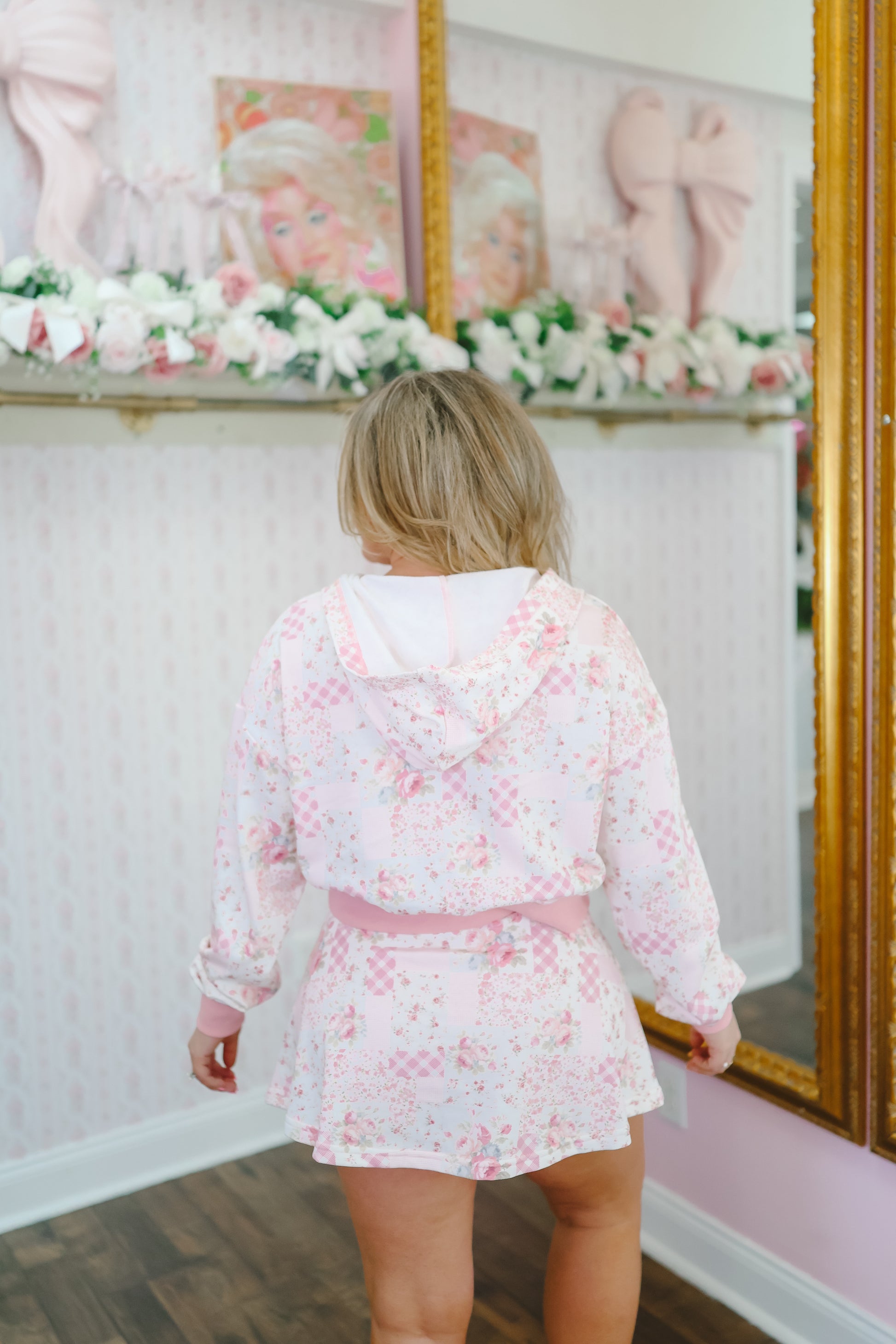 The Mikayla Ditsy Floral Patchwork Skort in pink multi blends sweet style with everyday comfort. Featuring a feminine patchwork floral print with a flattering skort silhouette, this piece offers the look of a skirt with the ease of built-in shorts—perfect for effortless, girly outfits.