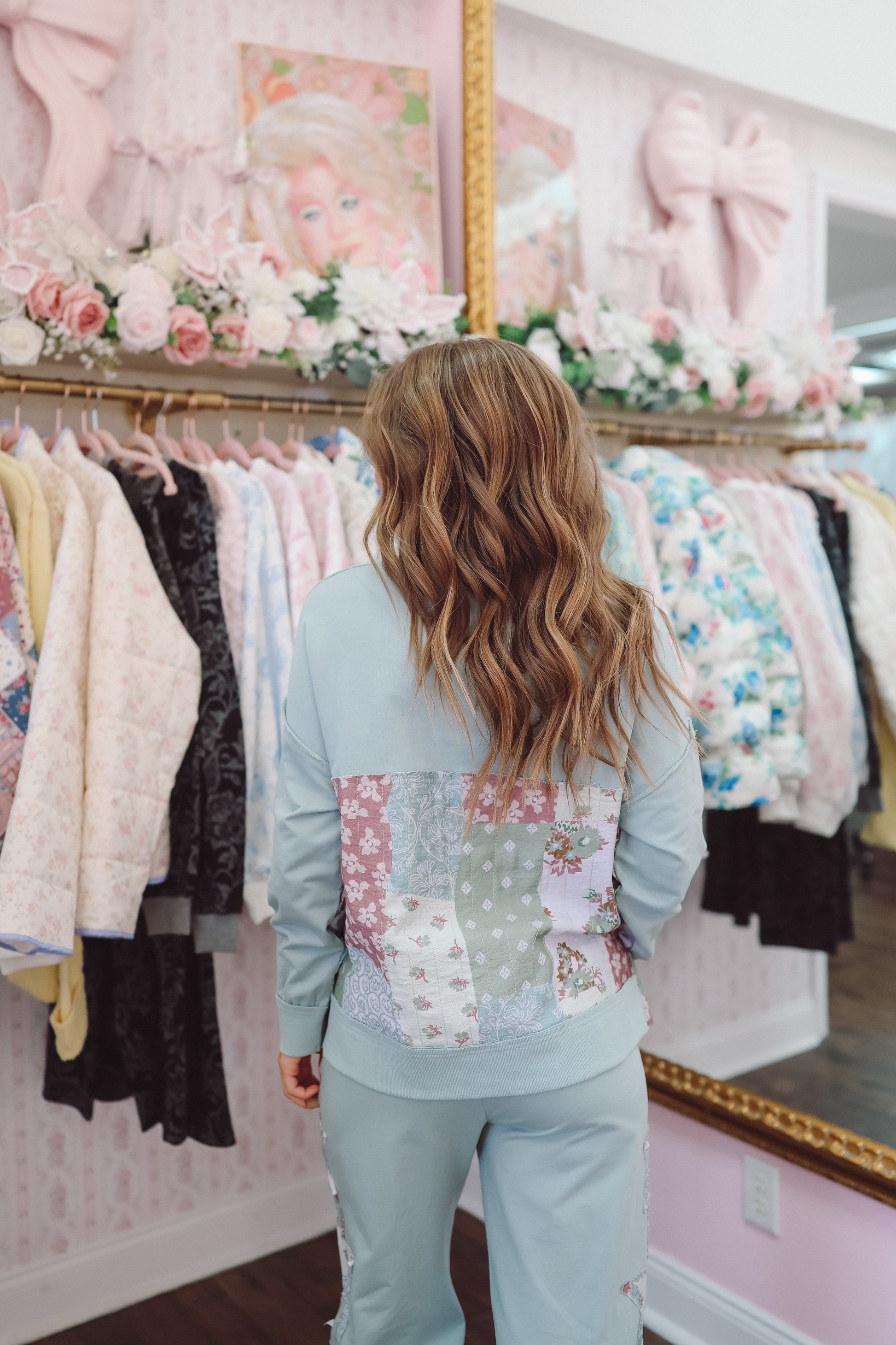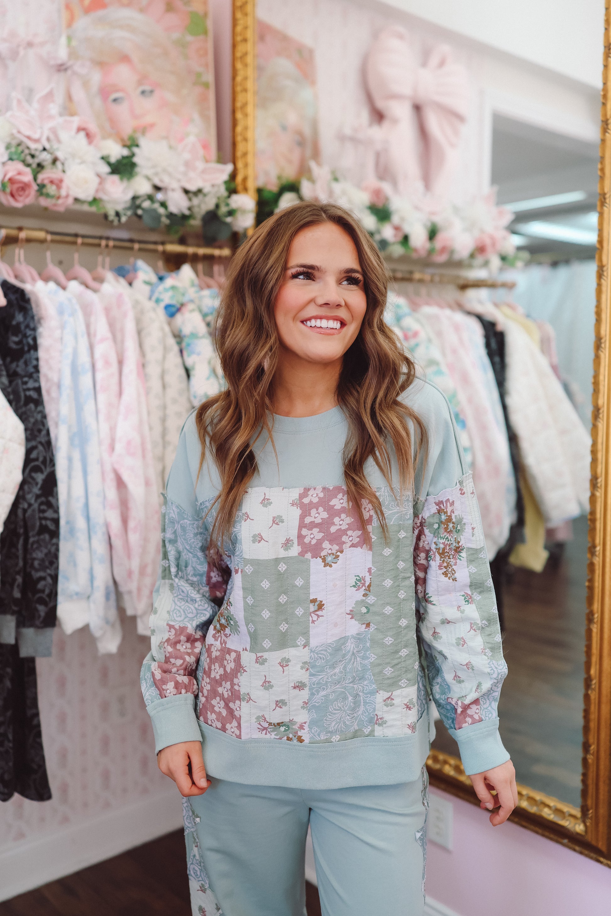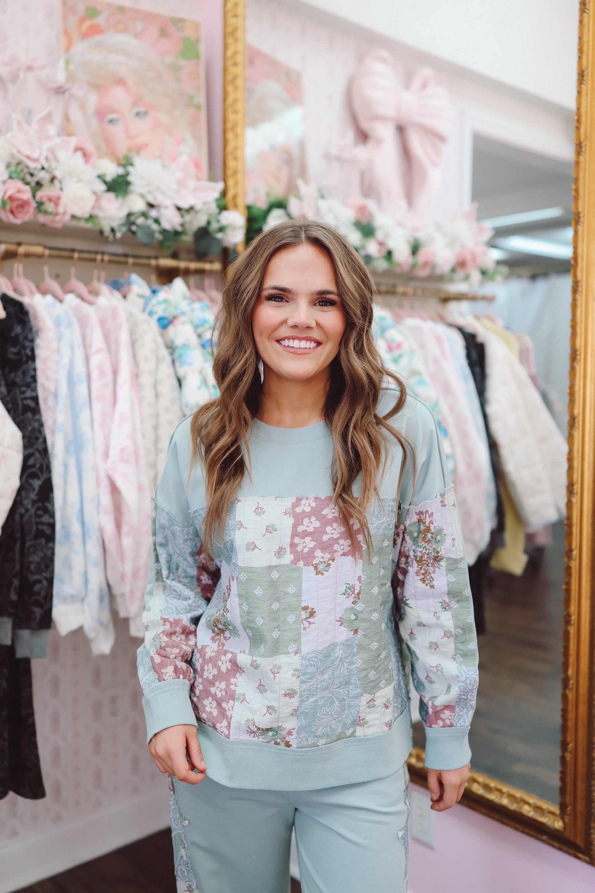 Meet the Nina Patchwork Pullover Top — a charming blend of vintage-inspired florals and soft sage tones that feels cozy, feminine, and effortlessly elevated. This standout sweatshirt features a beautifully quilted patchwork panel across the chest and sleeves, giving it a handcrafted, boutique feel you won’t find anywhere else. The relaxed silhouette and soft knit fabric make it perfect for casual days, travel, errands, and lounging while still looking styled and intentional. Pair it with the matching lounge pants for a dreamy set, or mix it into your everyday wardrobe for a sweet pop of color and texture.