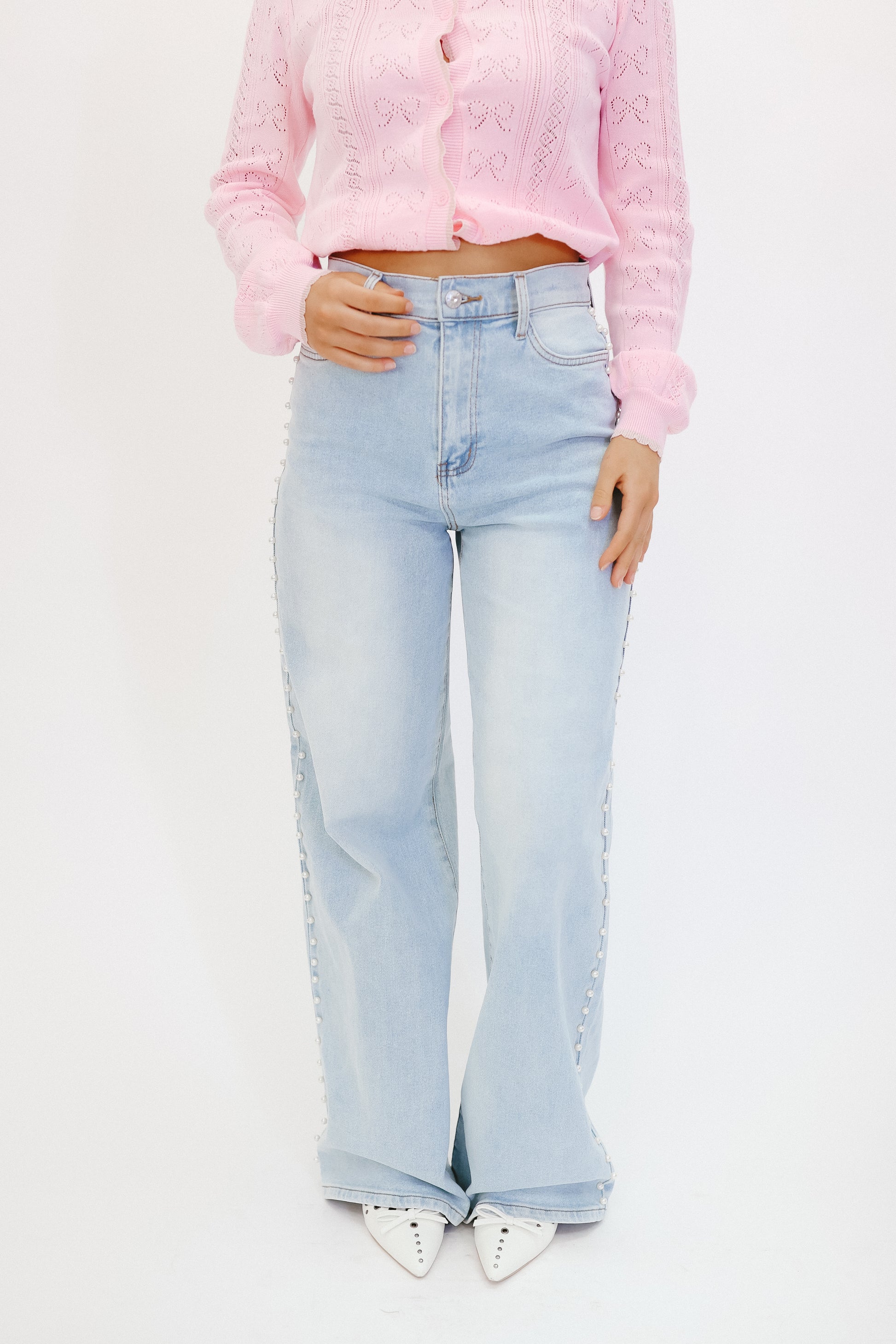Bring a touch of feminine flair to your denim collection with the Reese Pearl Studded Wide Leg Jeans in light wash. These statement jeans feature elegant pearl detailing down the sides, giving a chic upgrade to the classic wide-leg silhouette. With a flattering high-rise fit and vintage-inspired light wash, they’re the perfect mix of timeless and trendy. Whether paired with a sleek bodysuit or a casual crop top, these jeans make everyday outfits feel effortlessly elevated.