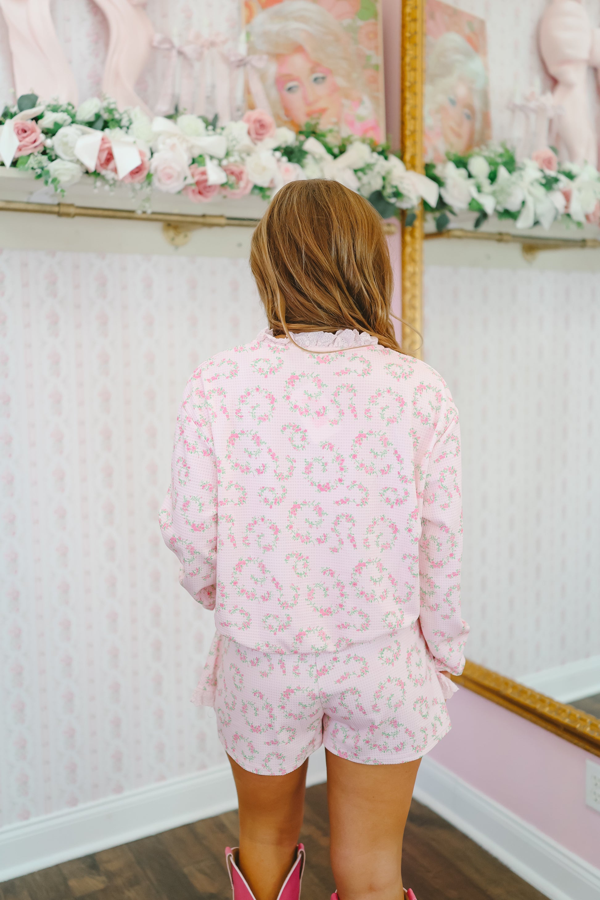 Soft pink floral print throughout