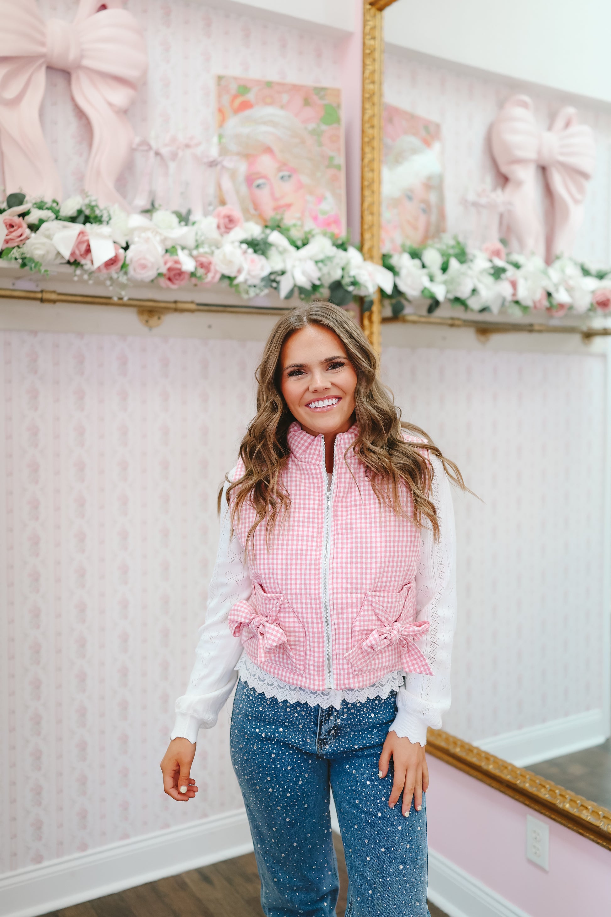 The Shawn Gingham Bow Puffer Vest is the ultimate coquette layering piece. Featuring soft pink gingham quilting and an oversized bow pocket detail, this vest adds charm and warmth without the bulk — perfect for elevating everyday outfits.