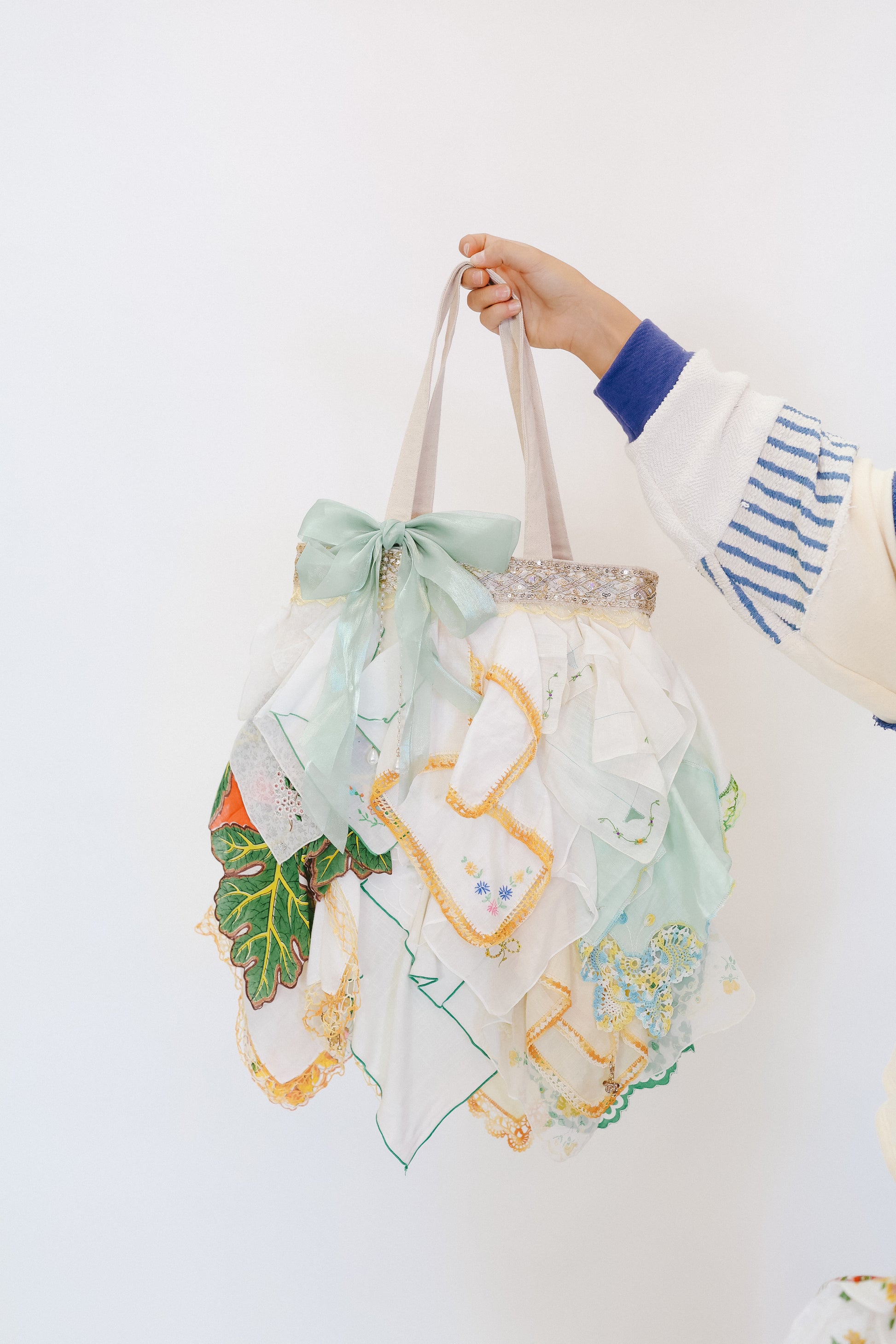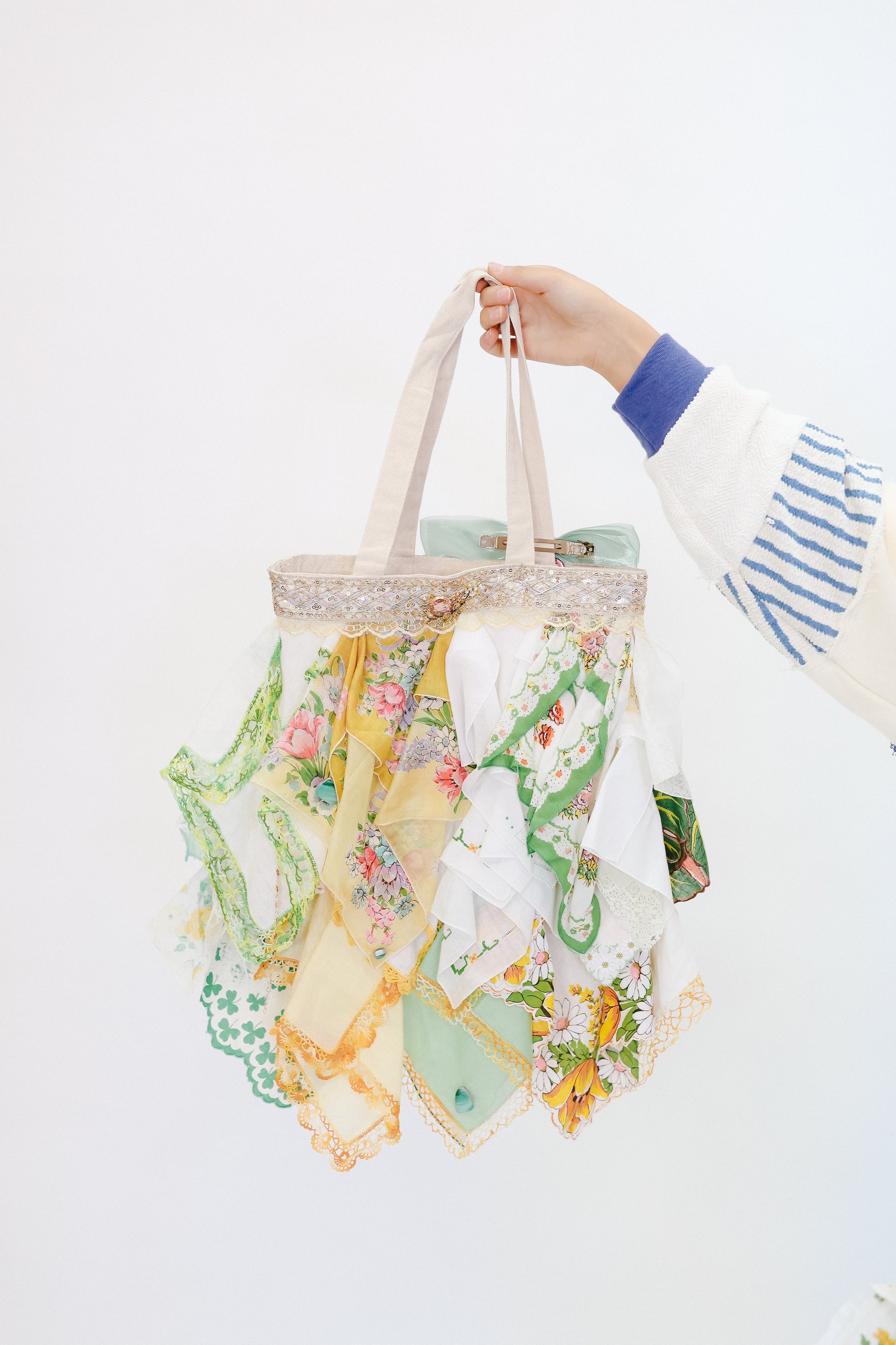 These bags are handmade by Karyn in the kitchen of her home nestled in Portland, Tennessee and the vintage and Victorian-era hankies are all organically sourced at the time of production of each bag. These bags are truly one of a kind, and there will never be two of the same bags, simply just because you can't find hankies that are two of a kind. We are so excited to finally have premade bag options available online to you to avoid wait times on custom orders! What you see photographed is what you get! If you are searching for perfection- these are not the bags for you! There are memories and moments in every hankie and piece of jewelry attached (some costume and some vintage) so you should expect wear spots on your bag. Karyn has perfected hiding most of the imperfections, but be aware you are buying a piece of art, history, and someone’s life moments.