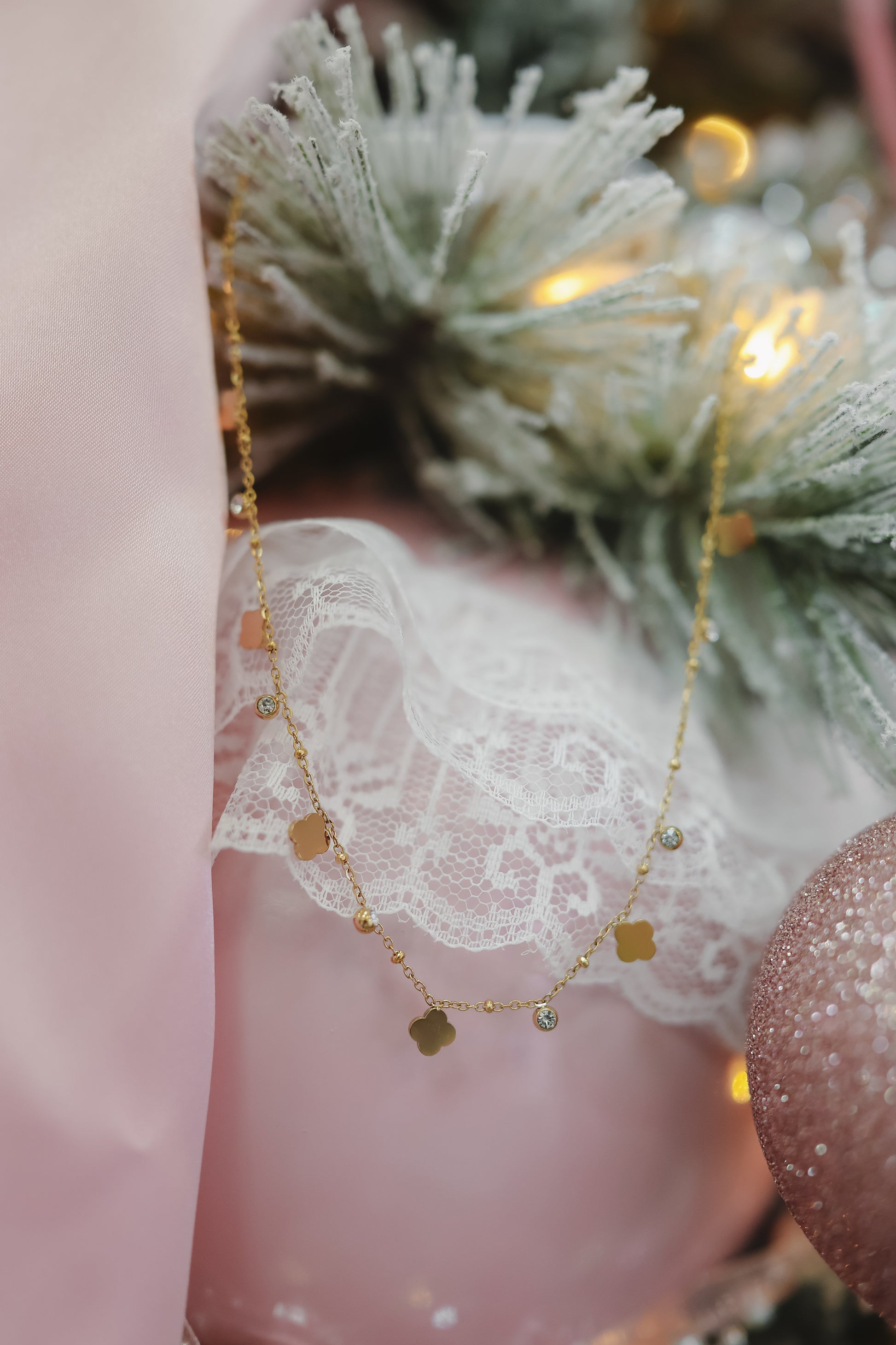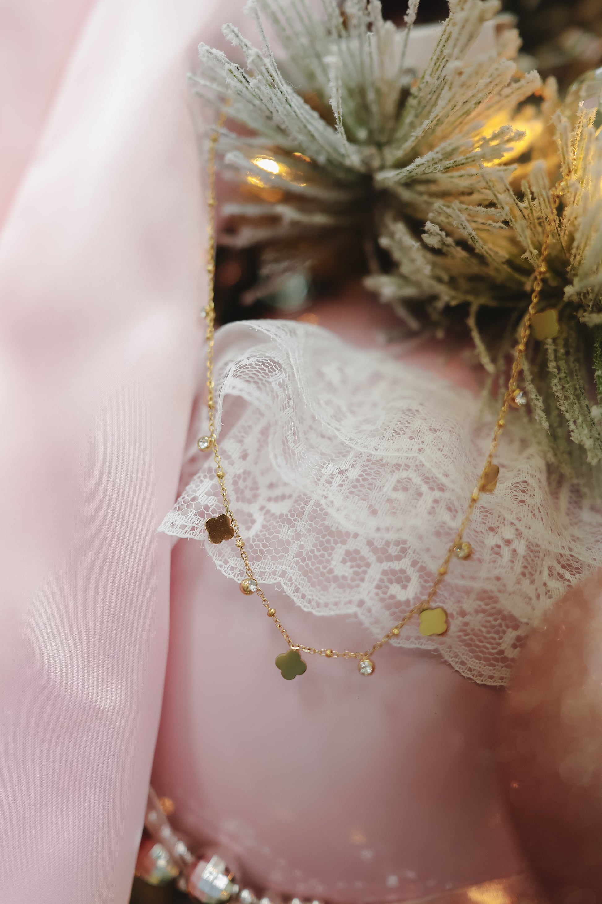 The Stacia Mini Clover Necklace is a delicate, dainty layering essential that brings a touch of everyday elegance to any outfit. Designed in a rich gold finish, this necklace features tiny clover charms and shimmering mini crystals that catch the light beautifully. Feminine, timeless, and easy to style, Stacia adds that subtle coquette sparkle—perfect for gifting, layering, or elevating your daily look. Whether you’re dressing up a simple tee or pairing it with soft knits and dresses, this necklace brings effortless charm and polished sophistication to your jewelry rotation.