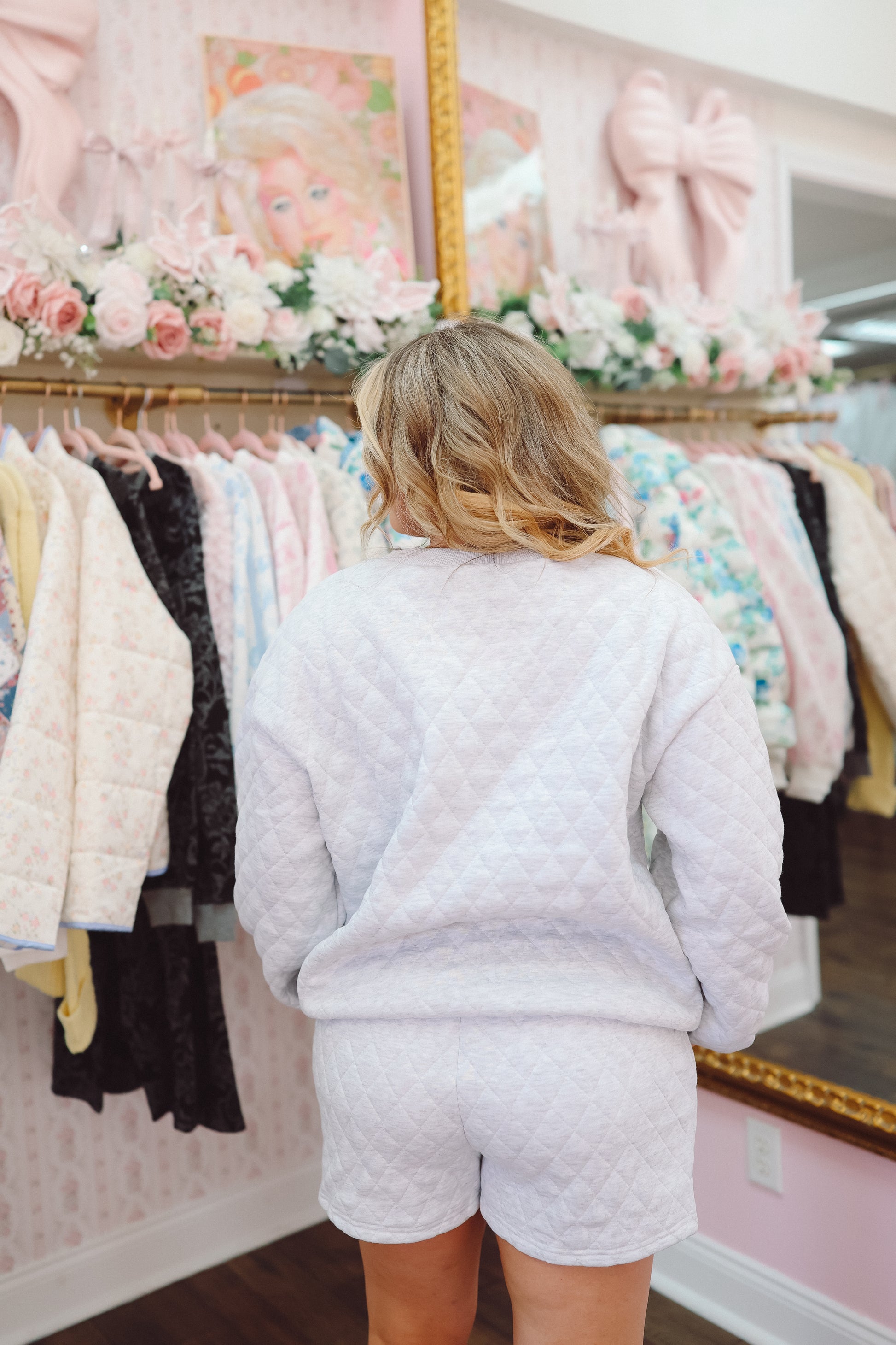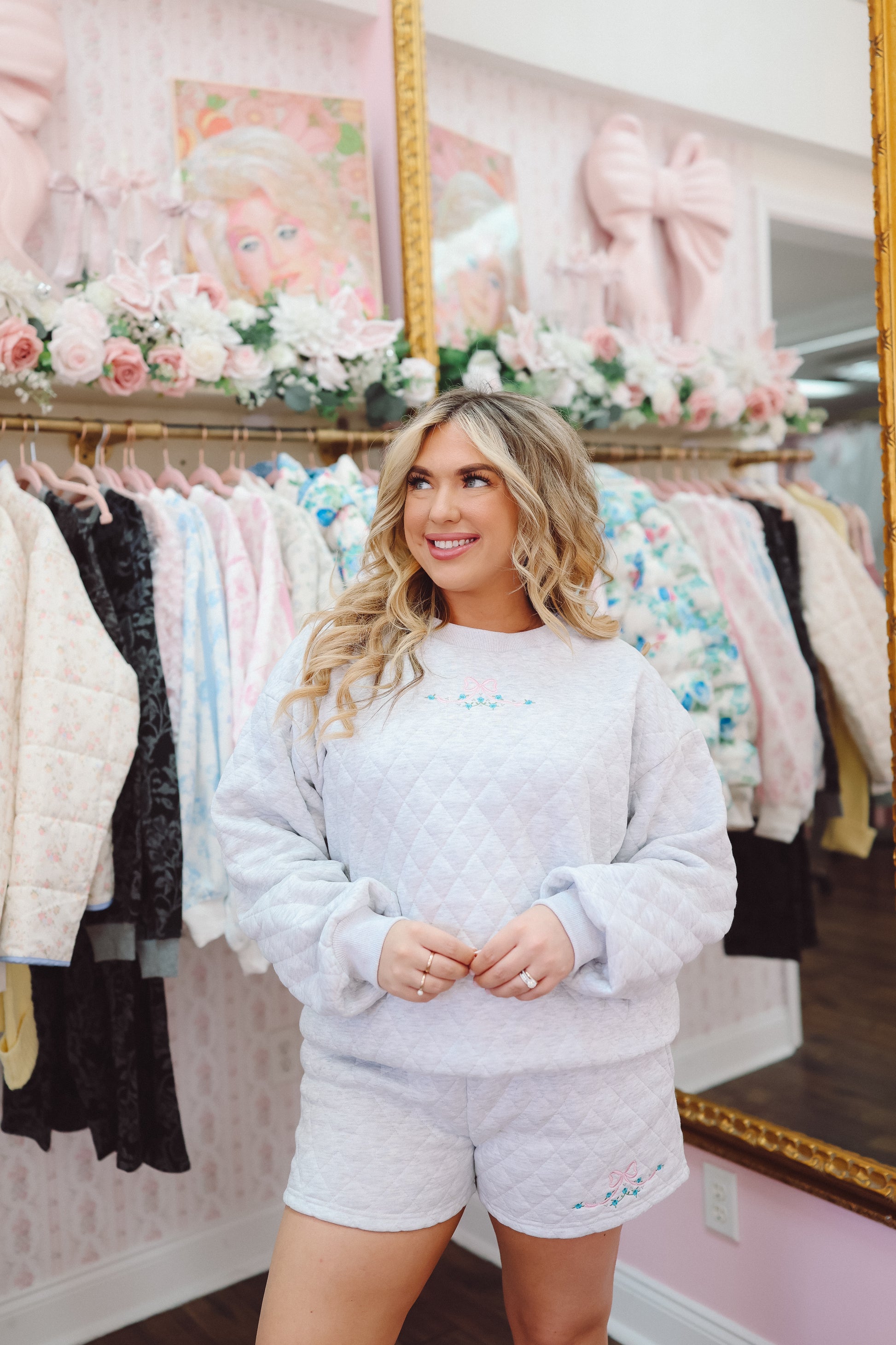 Cozy meets coquette in our Stephanie Embroidered Quilted Set — the soft heather grey lounge duo your wardrobe will love. Designed with a lightweight diamond-quilted texture, this matching top and shorts set gives you that ultra-plush, cloud-soft feel while still looking polished for errands, travel days, or relaxed weekends at home. Delicate embroidered bows and florals add a sweet feminine touch to the neckline and shorts, creating the perfect blend of comfort and charm. The relaxed-fit pullover drapes effortlessly, and the matching shorts include a comfy elastic waistband for a flattering, stay-put fit. Whether you’re styling it as a complete set or mixing each piece into your everyday looks, this quilted lounge set brings an elevated softness to your off-duty style.