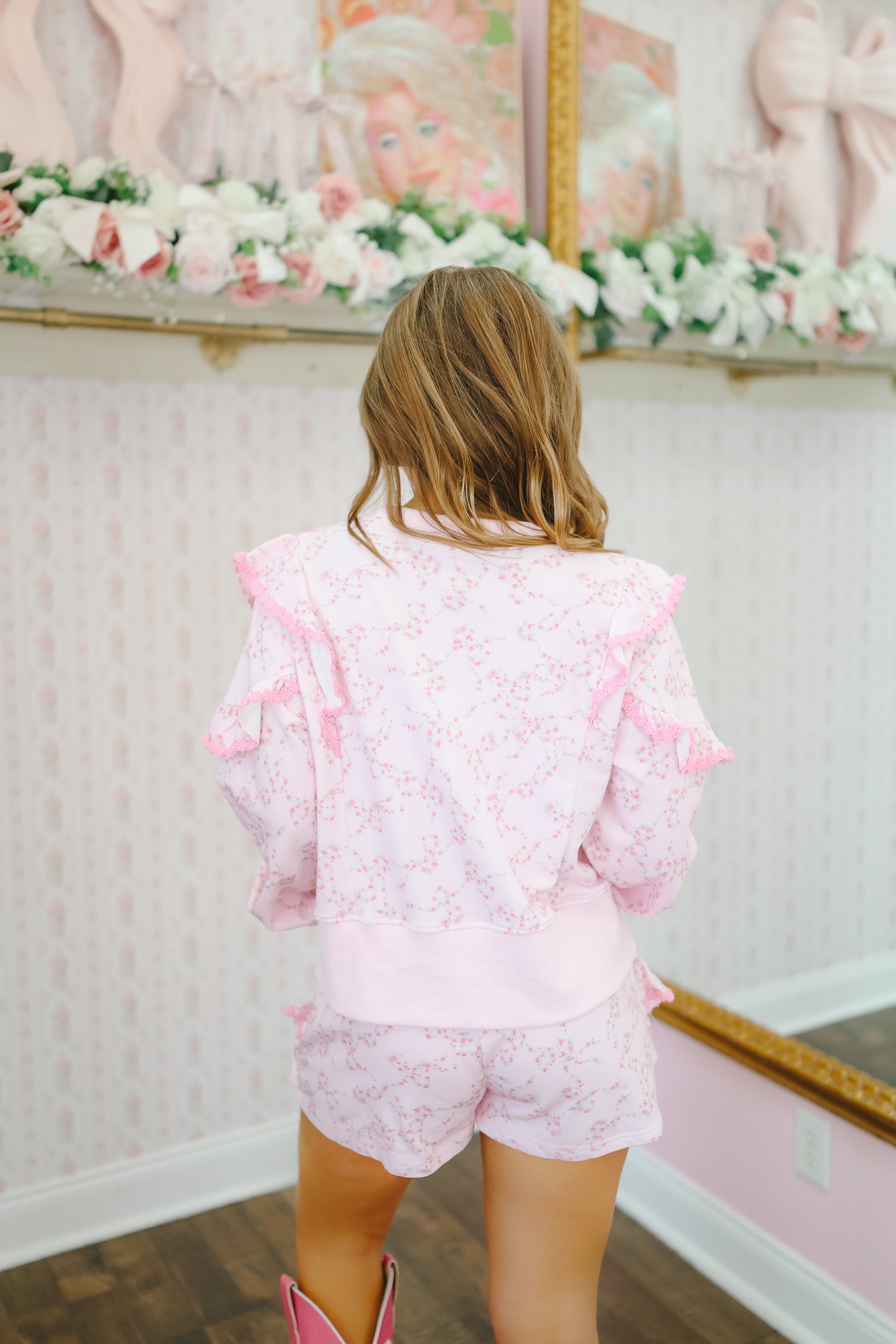 The Terrie Floral Ruffle Short Set in pink is the perfect blend of cozy and feminine. Featuring a soft floral print, ruffle details, and a relaxed two-piece silhouette, this set delivers effortless style with a sweet, girly touch.